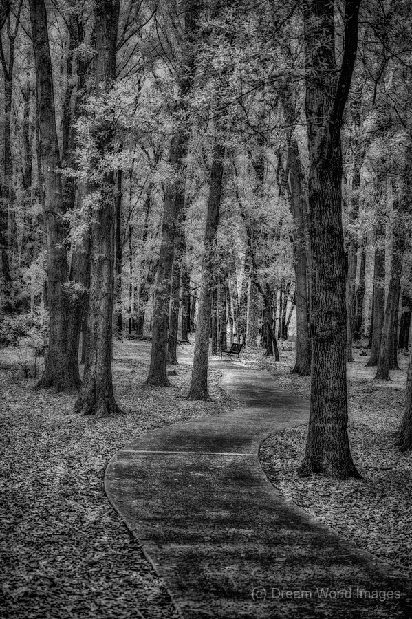 Infrared image from Sholom Park outside Ocala Florida with a single park bench.