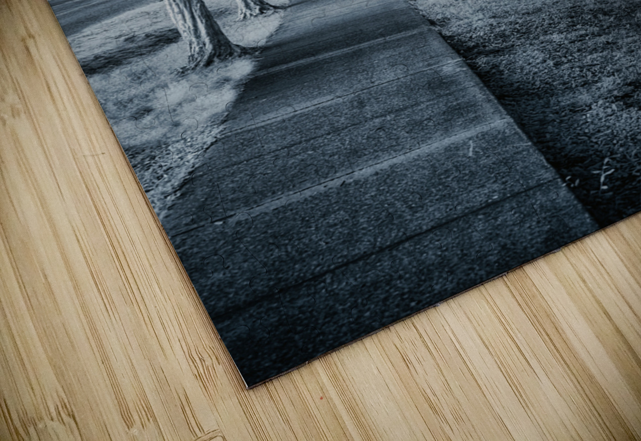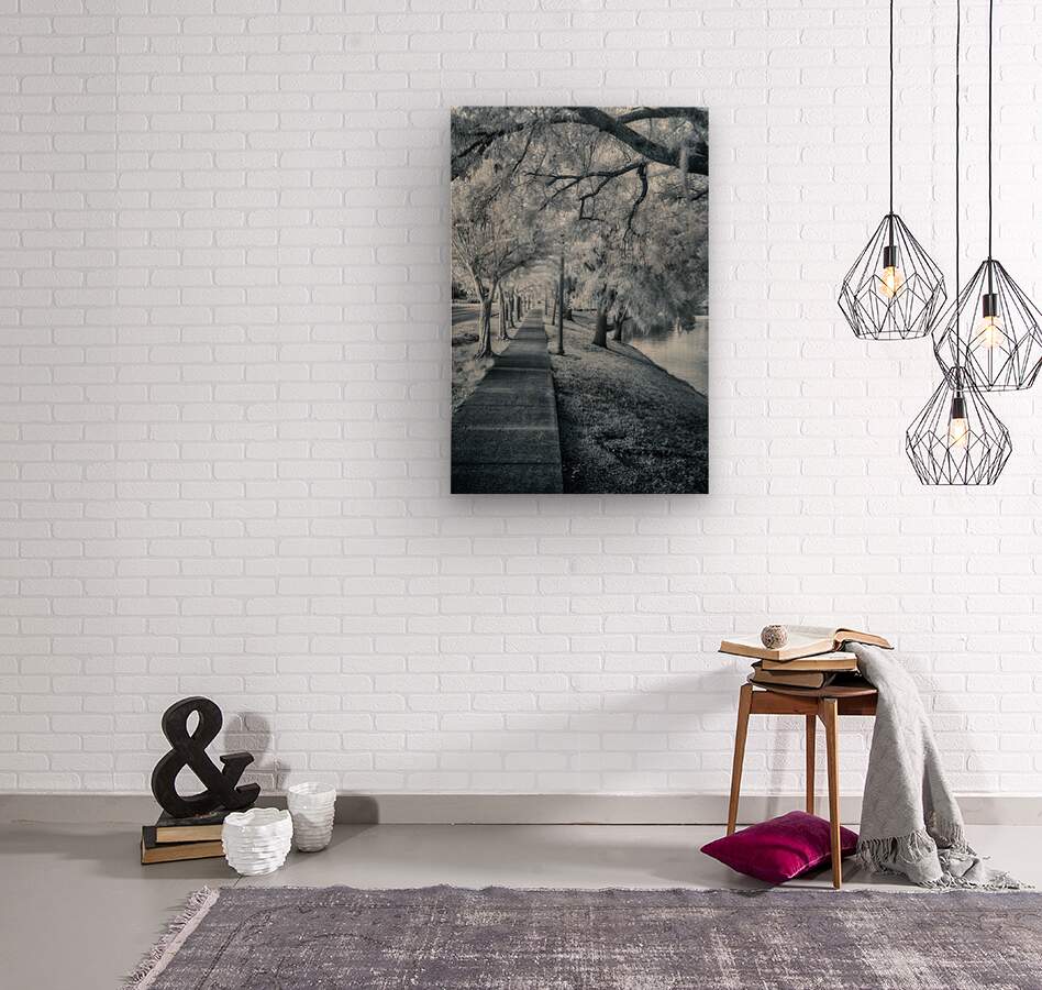 A dreamy black and white study of Ocala's historic charm, where Spanish moss creates nature's own archway above a peaceful waterside path. Through monochromatic artistry, this familiar Florida scene transforms into a timeless passage where each moss-draped oak stands sentinel over quiet waters. The gentle curve of the path invites viewers to wander through this Southern sanctuary, where light and shadow dance beneath centuries-old canopies.