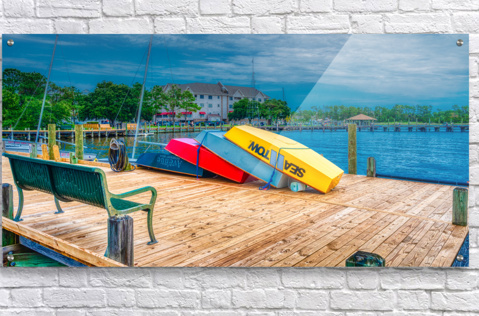 Step into the enchanting world of Manteo, North Carolina, where vibrant colors and tranquil waters come together to create a stunning piece of art. This dockside scene captures the beauty of a peaceful bay in this charming coastal town, inviting you to immerse yourself in its serene atmosphere. Wooden planks stretch out before you, leading your eyes to the serene blue water beyond. Three colorful boats rest peacefully on the dock, each adorned with intricate inscriptions that pay homage to this historic location's rich history and culture. A green metal bench beckons you to sit and take in the breathtaking view, offering a moment of quiet reflection amidst the bustling activity of the waterfront. Above, white clouds dance in the sky, casting ever-changing shadows on the water below, creating a sense of peace and tranquility unique to Manteo. This artwork is a true masterpiece, capturing the essence of beauty and serenity that defines this picturesque seaside town in North Carolina. Let it transport you to a place where time seems to stand still, and the beauty of nature surrounds you at every turn.