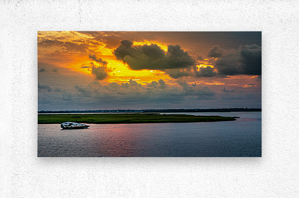 A boat that grounded during a stom with the sun setting behind a storm.