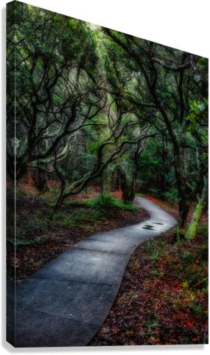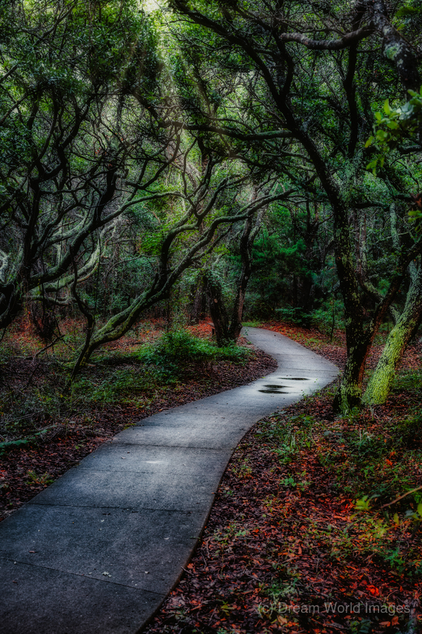Embark on a magical journey through Jockey's Ridge State Park on the Outer Banks of North Carolina, where nature weaves a spellbinding tale. After a summer rain, a path winds through a mesmerizing twist of oak tree branches, creating a captivating walkway that beckons exploration. The canopy of oak branches forms a natural labyrinth, where sunlight filters through the leaves, casting a play of enchanting light and shadows on the forest floor. Each step becomes a dance with nature, as the rain-kissed leaves shimmer in the dappled sunlight, creating an ethereal atmosphere. As you traverse the winding path, the fragrance of damp earth and the vibrant hues of greenery transport you to a world of wonder. The twists and turns of the oak branches create a canopy that feels like a secret passage to a hidden realm, where magic lingers in the air. This photograph is not just a snapshot; it's a visual portal to the enchantment of Jockey's Ridge State Park. The post-rain ambiance adds a refreshing touch to the scenery, making the walkway an invitation to connect with the natural beauty that surrounds you.