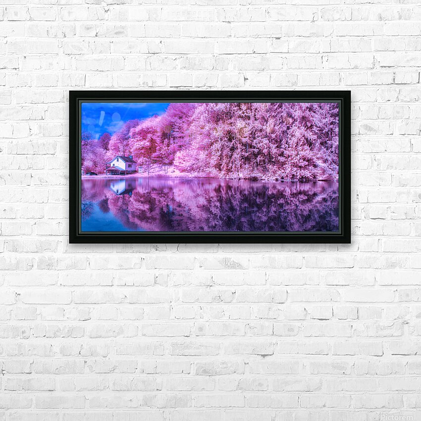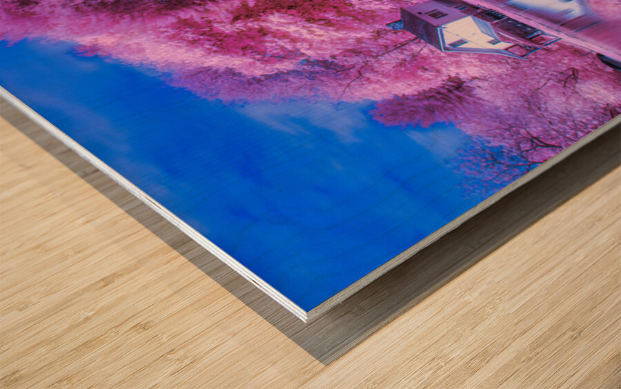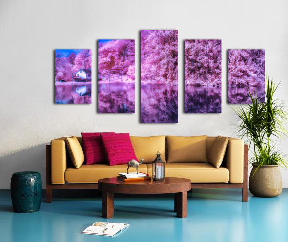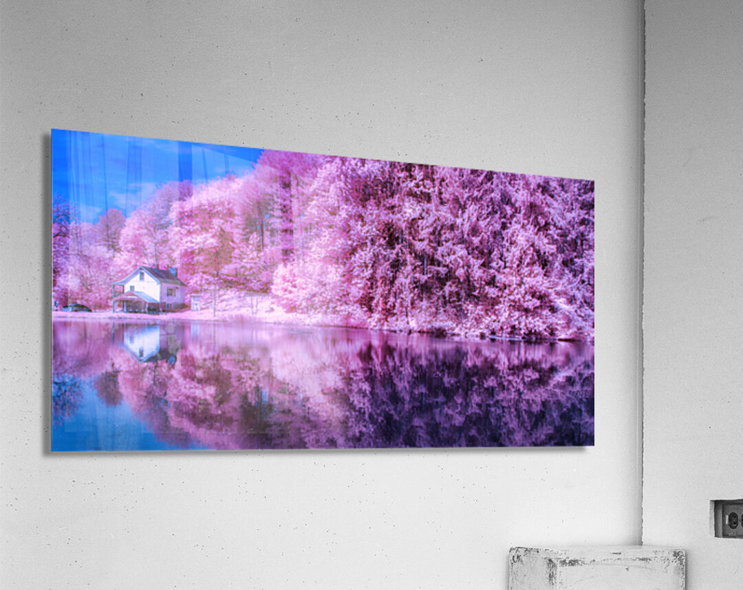 Step into a dreamlike scene where reality merges with vibrant hues. This colorful infrared image captures a small house perched on the shores of a ref...[+]