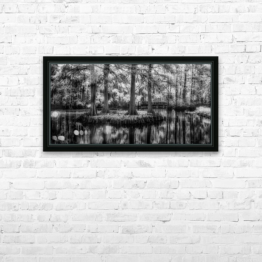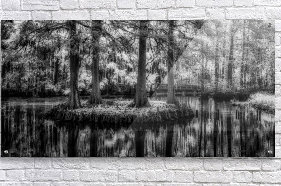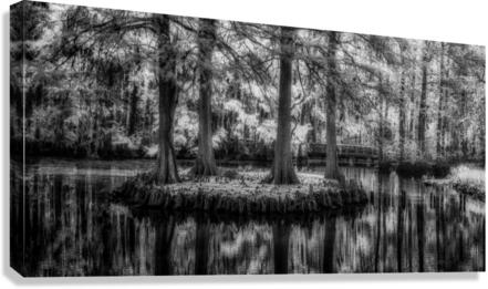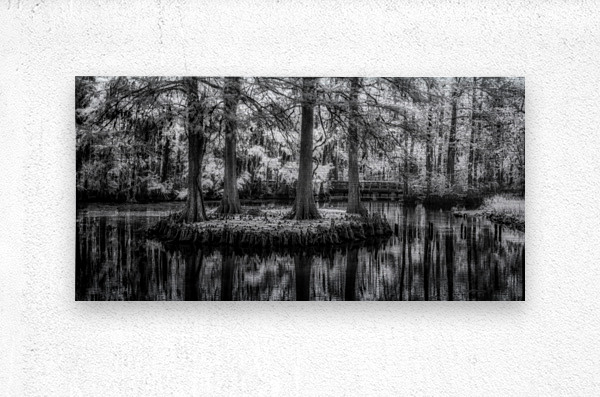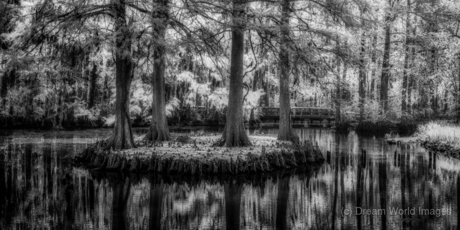 An infrared image of four Bald Cypress on a small island in Swan Lake Iris Garden in Sumter South Carolina.