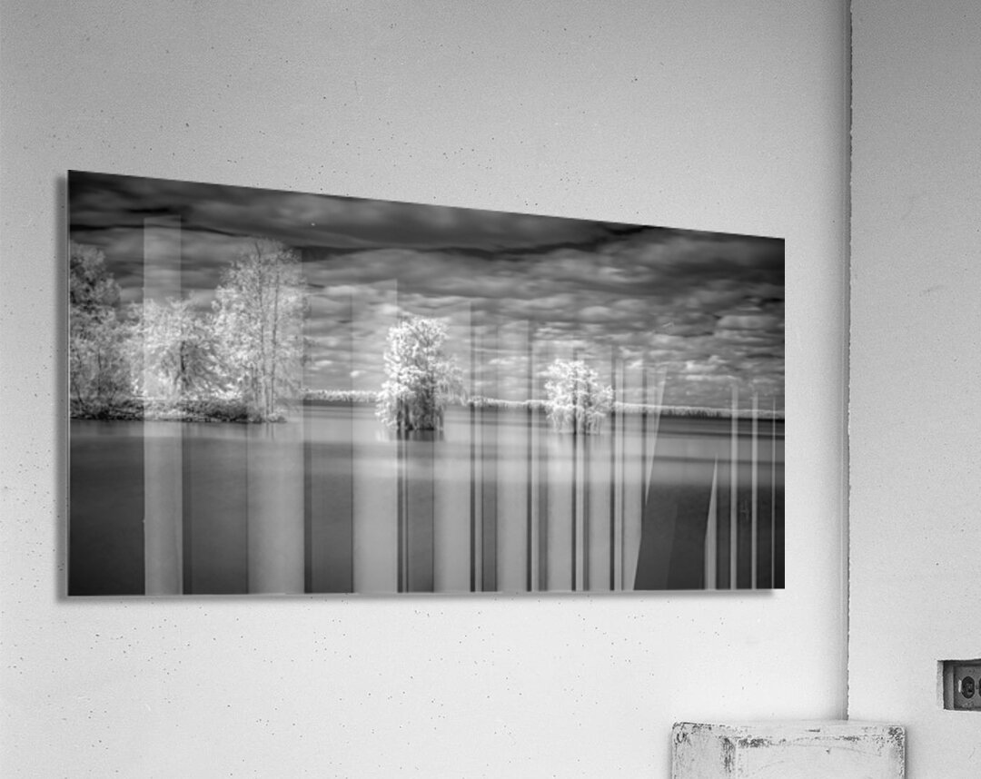 As I ventured into the serene landscapes of Santee State Park in South Carolina, I immersed myself in a world of quietude and wonder reminiscent of the captivating allure of "Tranquil Cypress Dreams." The scenery before me seemed to be lifted from the pages of a surreal painting, with the ethereal beauty of infrared photography casting a spell of peaceful isolation over the tranquil waters. The landscape, captured in what appeared to be mesmerizing infrared photography, presented a scene of serene beauty and otherworldly charm. Foliage emerged in bright whites and light tones, contrasting with the darker tones of the sky and water, creating a surreal atmosphere that invited contemplation and wonder. As I gazed upon the calm expanse of water, reflecting the subdued sky with its dense arrangement of soft, billowy clouds, I felt a sense of tranquility wash over me. The glassy smoothness of the water, possibly achieved through long exposure, enhanced the reflective and tranquil aspect of the scene, evoking a profound sense of peace and serenity. Prominent in the composition were several groupings of trees or shrubs emerging from the water, their bright foliage standing starkly against the sky and clouds. The image's tonal range, from deep blacks to shades of gray and bright whites, added depth and dimension to the hauntingly beautiful tableau, drawing me further into its captivating allure. It was a moment of pure enchantment, where time seemed to stand still amidst the serene landscapes of Santee State Park. As I lost myself in the interplay of light and shadow, I couldn't help but feel a sense of wonder and awe at the beauty of the natural world surrounding me.