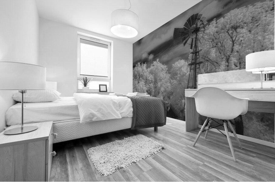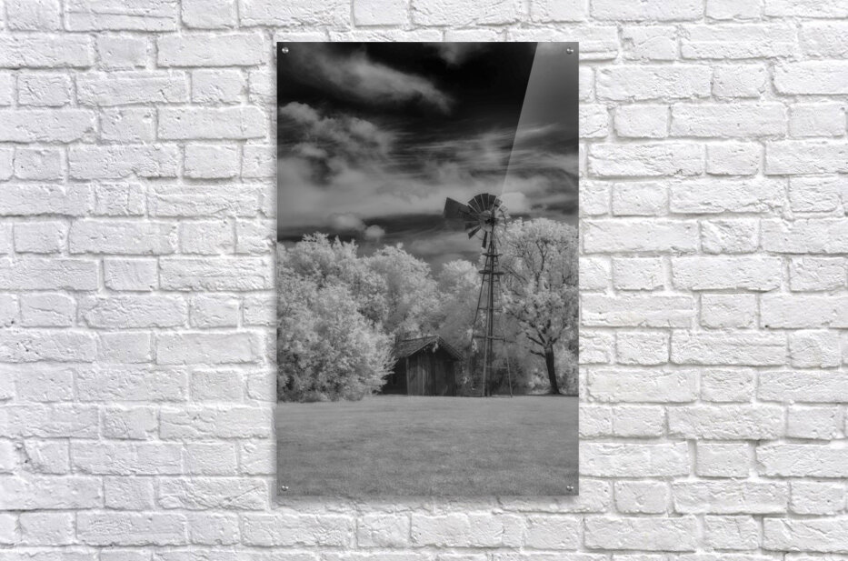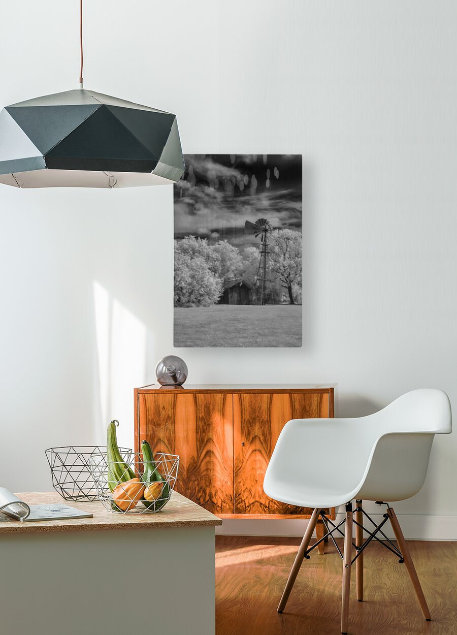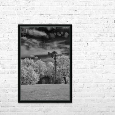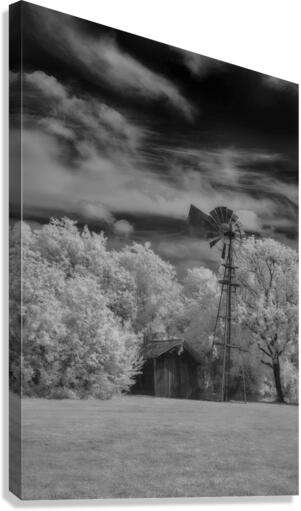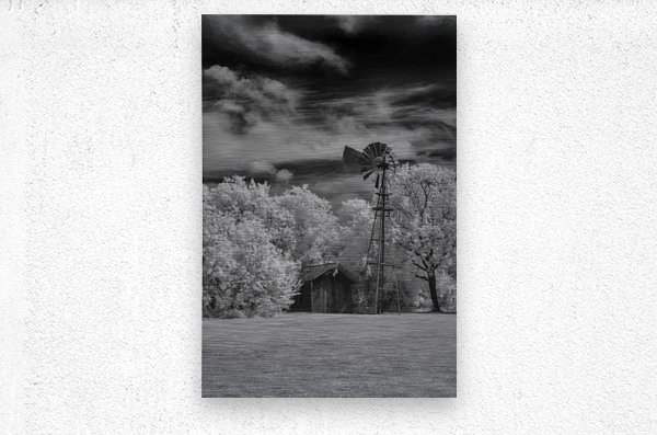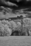 Step into the past with a captivating invisible light image from the Penn Farm at Cedar Hill State Park in Texas, where the legacy of John Anderson Penn unfolds amidst rugged cedar-covered hills. This monochromatic scene transports viewers to a bygone era, evoking a sense of nostalgia and tranquility. The image features an old-fashioned windmill towering over a small, rustic shed, captured in striking infrared. The bright, white foliage on the trees contrasts starkly with the dark, dramatic sky filled with billowing clouds, creating an ethereal and otherworldly feel. The traditional mechanical windmill, with its large wheel of many vanes and tail for orientation, stands poised atop a slender tower, a testament to past craftsmanship. The shed, slightly dilapidated and engulfed in vegetation, adds to the sense of antiquity and tranquility, embodying the quiet solitude of rural life. Balanced composition places the windmill slightly off-center to the left, offering visual interest and a sense of scale against the surrounding elements. The grassy ground anchors the scene, providing a smooth texture that contrasts with the detailed, intricate canopy of the trees. Overall, the image conveys a timeless elegance, inviting viewers to immerse themselves in the rich history and natural beauty of Penn Farm at Cedar Hill State Park.