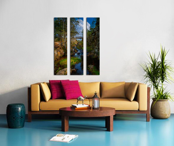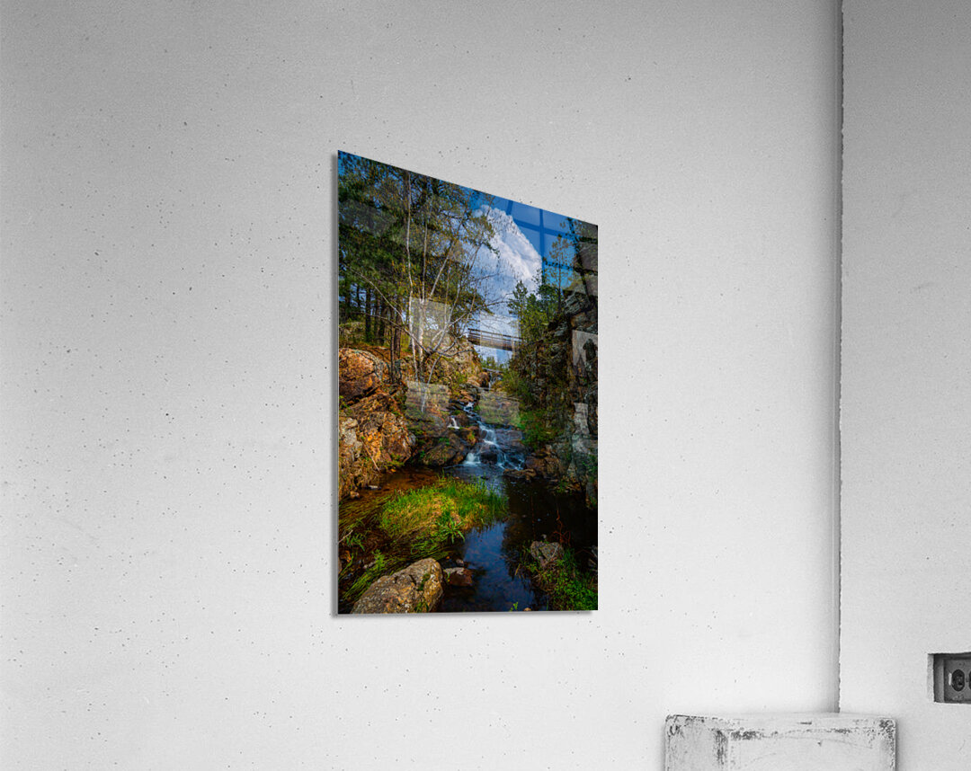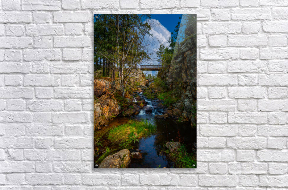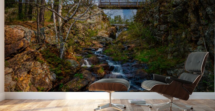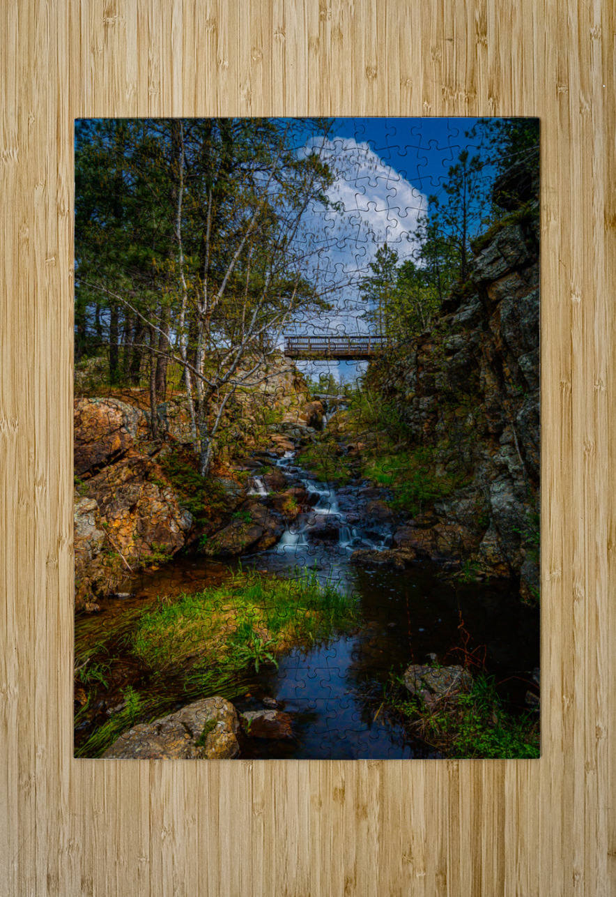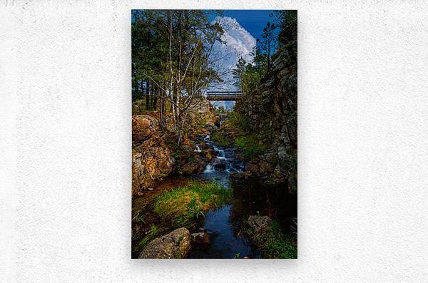 Nestled in the heart of Custer State Park, this enchanting scene captures nature's artistry where mountain waters tumble through ancient granite corridors beneath a rustic footbridge. The Black Hills' timeless beauty reveals itself in layers - from the dancing waters and weathered rocks to the sentinel birch trees reaching skyward. This intimate landscape shows the delicate balance between wild and wanderer, where human paths cross nature's eternal flow in South Dakota's treasured wilderness.