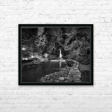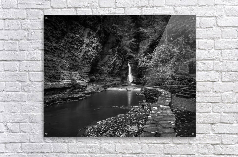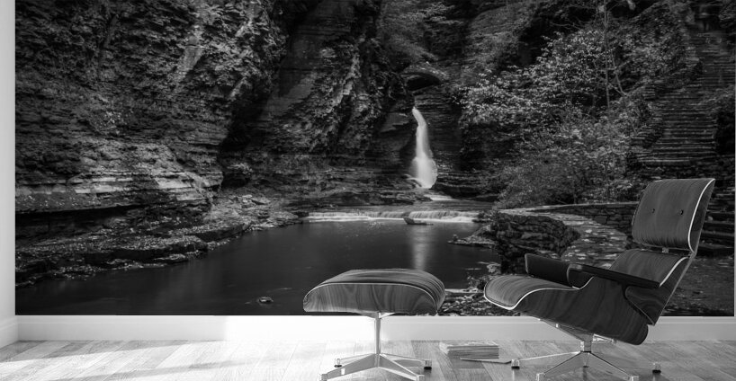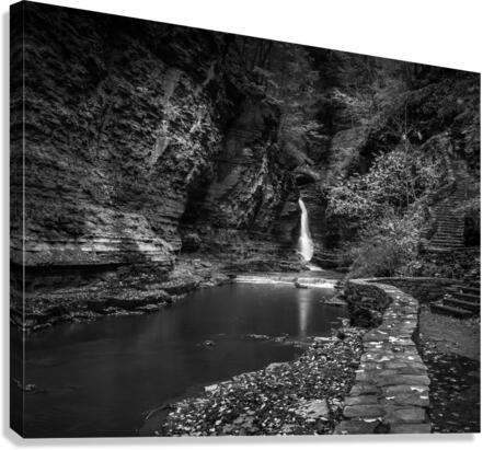 Deep within the ancient walls of Watkins Glen Gorge, a delicate waterfall creates nature's own spotlight against weathered stone. Through monochro...[+]