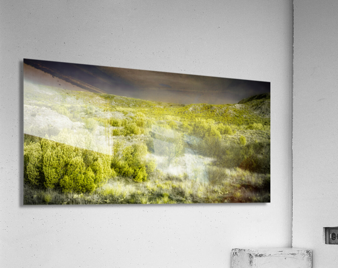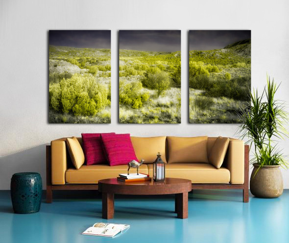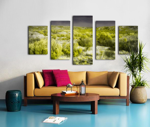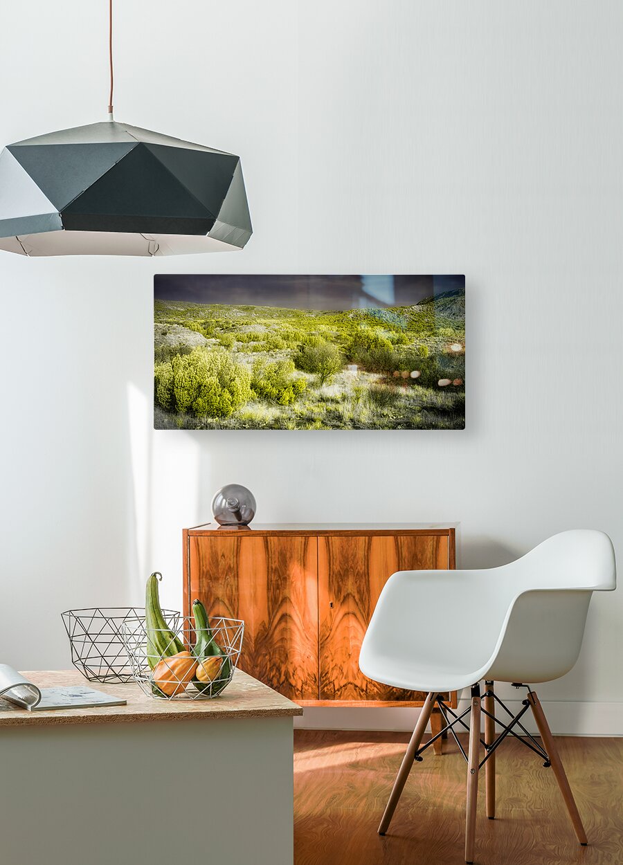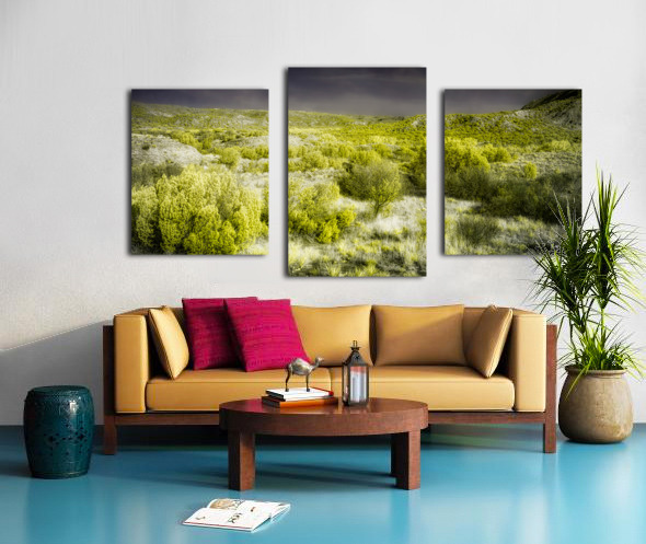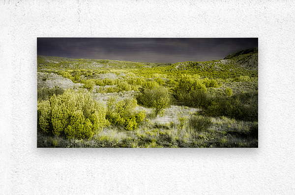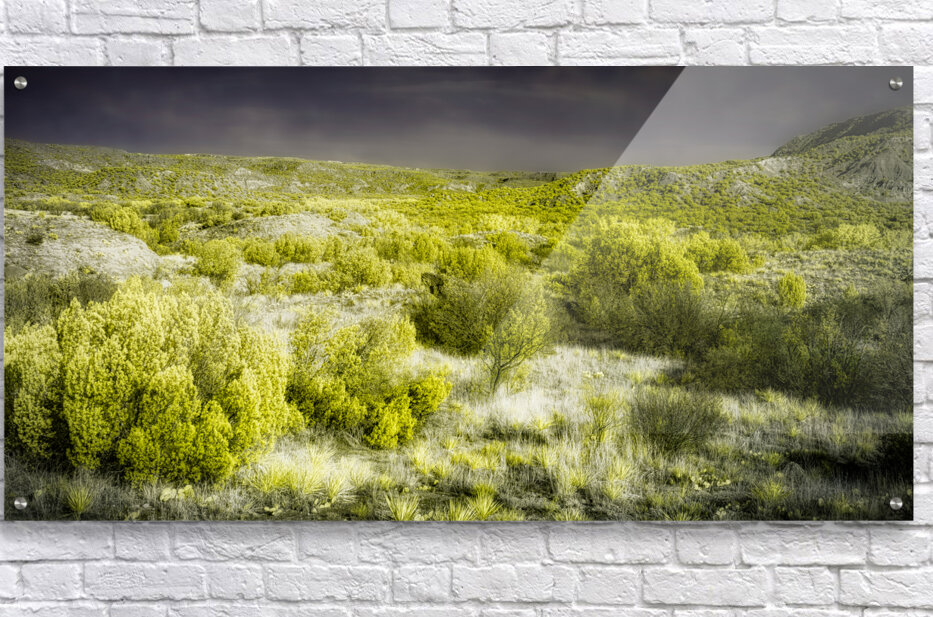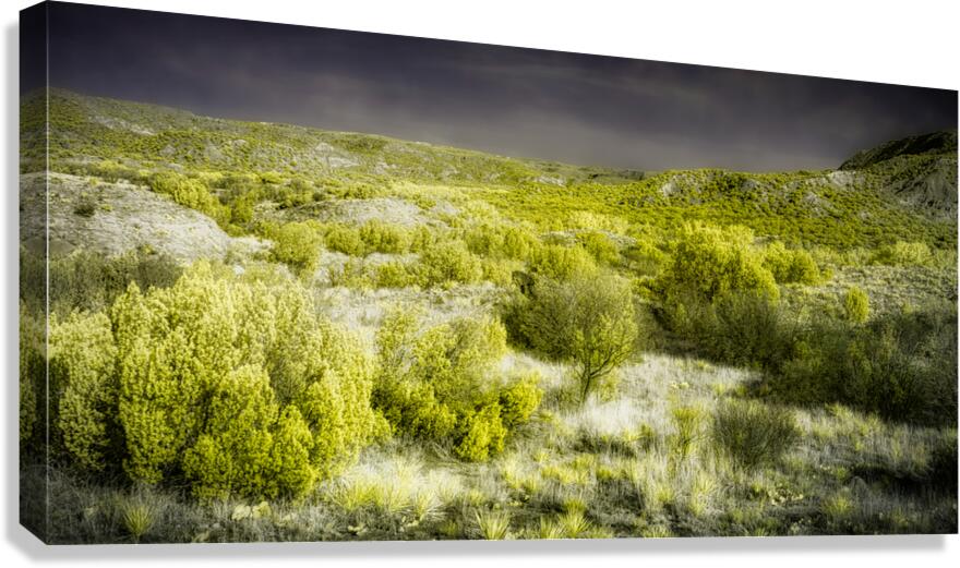 Step into a world where Palo Duro Canyon in West Texas's enchanting beauty unfolds before you. Here, shrubs and trees sway in a secret spectrum, bathed in the ethereal light of an unseen sun. Lush vegetation sprawls across the semi-arid landscape, weaving a mesmerizing tapestry of vibrant greens that shimmer and shift in the gentle breeze.  Rolling hills rise and fall like sleeping giants, their contours softened by a velvety cloak of foliage that stretches as far as the eye can see. Above, the sky stretches out in moody hues, hinting at hidden mysteries waiting to be unveiled among the canyon's rugged terrain. This enchanting photograph captures the essence of a moment suspended in time, offering a glimpse into a realm where the ordinary transcends into the extraordinary. Explore the depths of this enigmatic scene and lose yourself in its mystical allure.  As you wander through Palo Duro Canyon's surreal landscape, you'll be captivated by the interplay of light and shadow, the intricate details of nature's design, and the sense of wonder you feel being surrounded by such breathtaking beauty. Experience the magic of nature at its most enchanting with this stunning artwork that captures the essence of a hidden world within Palo Duro Canyon. From the vibrant hues of the foliage to the gentle sway of the trees, every detail is brought to life in vivid color and exquisite detail.  Step into this secret realm and let your imagination take flight as you explore the lush landscapes and mysterious horizons that await. Let this artwork transport you to a place of peace and tranquility, where nature reigns supreme and the boundless beauty of Palo Duro Canyon unfolds before you.