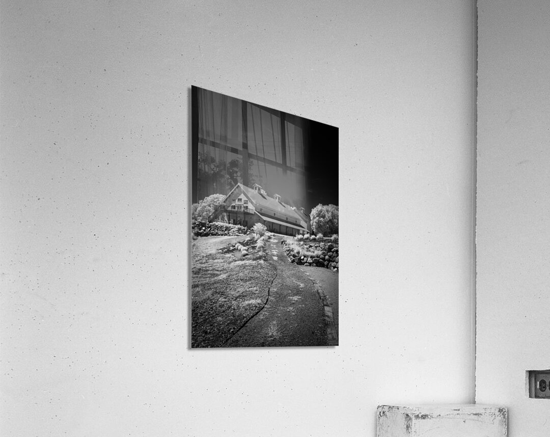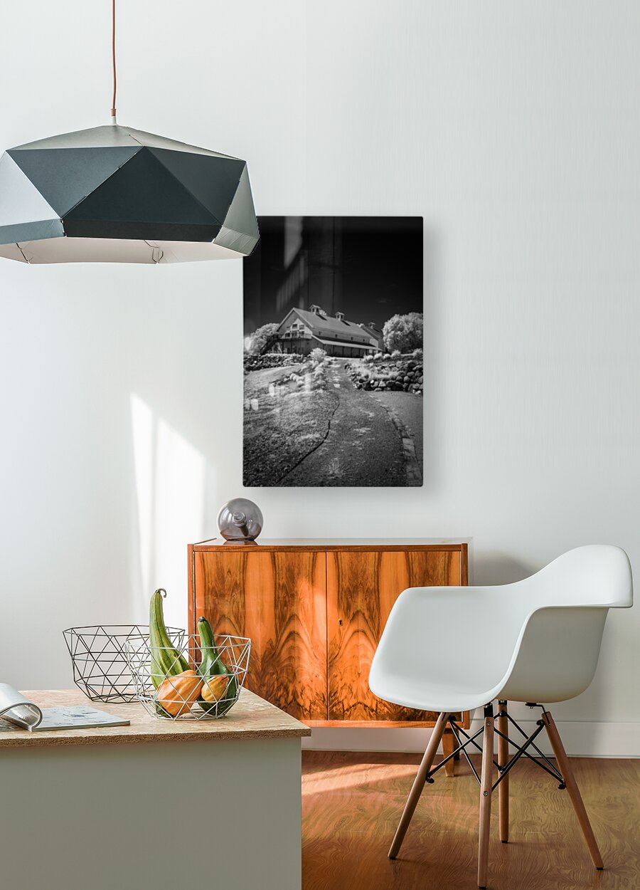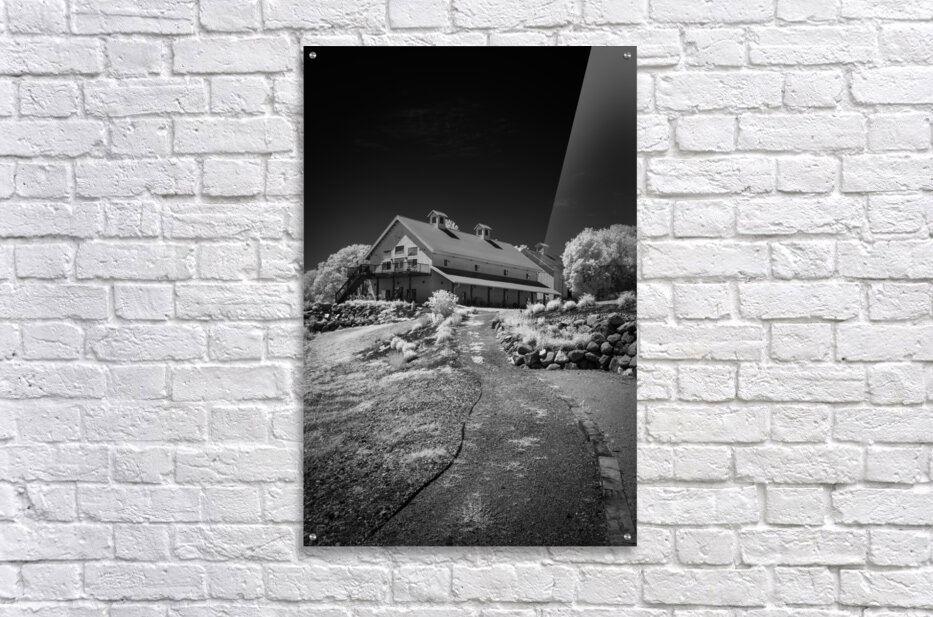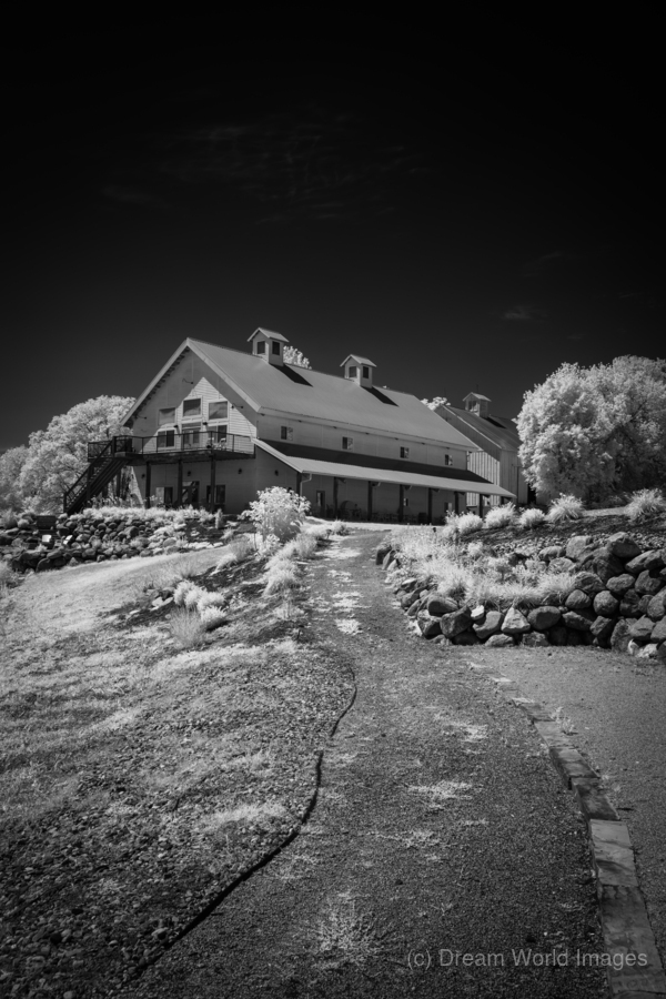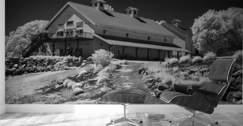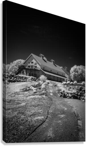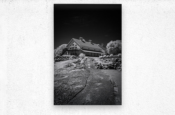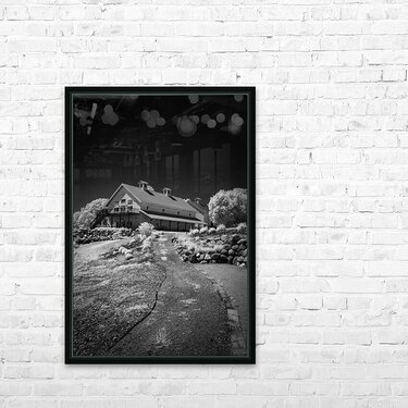 A monochromatic vision where invisible light transforms this grand barn into a luminous sanctuary. Stone walls anchor the structure to earth while infrared photography reveals the ethereal glow of foliage, creating a dramatic interplay of texture and light. The winding path leads viewers through a story of architectural strength meeting nature's delicate radiance.