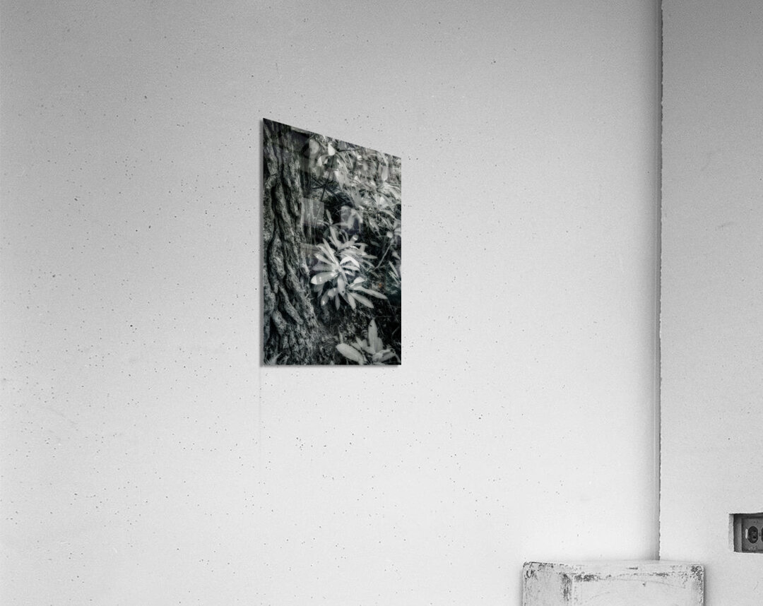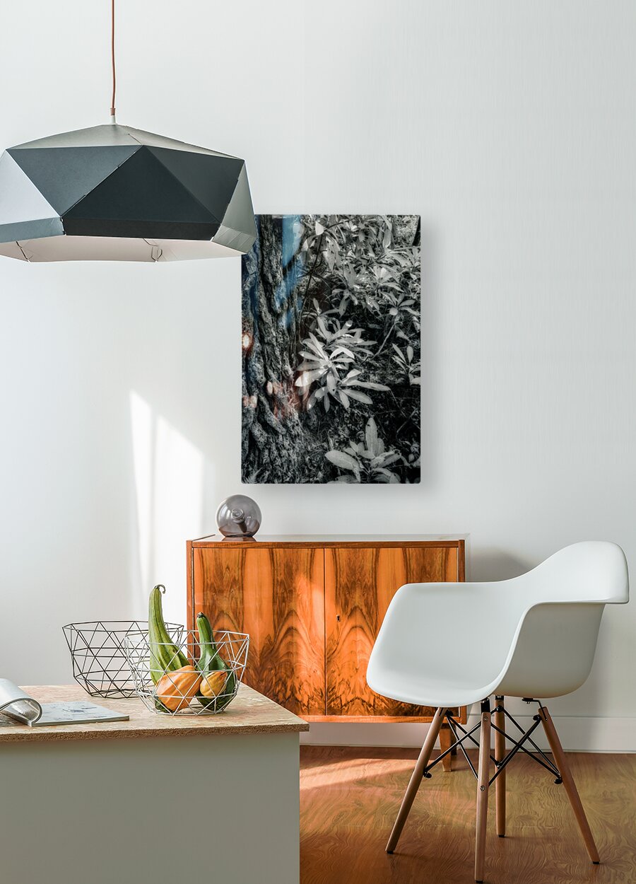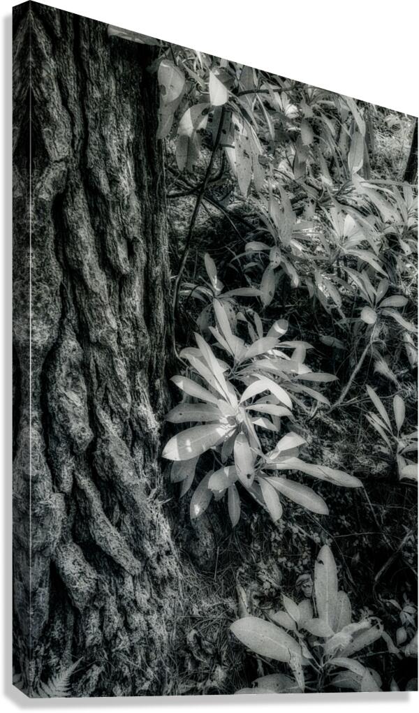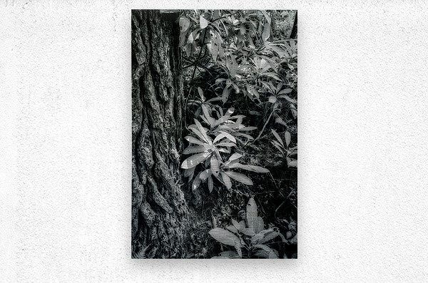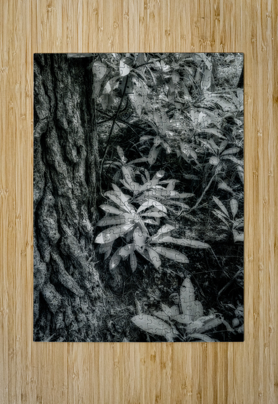 Step into a world where shadows and light converge in a mesmerizing dance among the lush Kentucky foliage. This stunning infrared black-and-white photograph captures the intricate beauty of nature's textures in a truly mystical way. The rugged bark of a majestic tree trunk towers to the left, commanding attention with its weathered lines and rough edges. In the foreground, delicate leaves flutter in the gentle breeze, their velvety surfaces dappled with shimmering specks of light. The interplay of light and shadow creates a mesmerizing dappled sunlight effect, casting a spell of enchantment over the entire scene. The viewer is transported to a dreamlike realm where every detail, from the leaves' intricate veins to the forest floor's earthy elements, invites closer inspection. As the sunlight dances through the leaves, creating patterns of contrast and illumination, a sense of mystery and wonder pervades the scene. This breathtaking artwork offers a unique perspective on the natural world, inviting viewers to immerse themselves in a captivating world of visual storytelling. With its blend of artistic vision and technical skill, this photograph captures the essence of the Kentucky landscape in an evocative and unforgettable way.