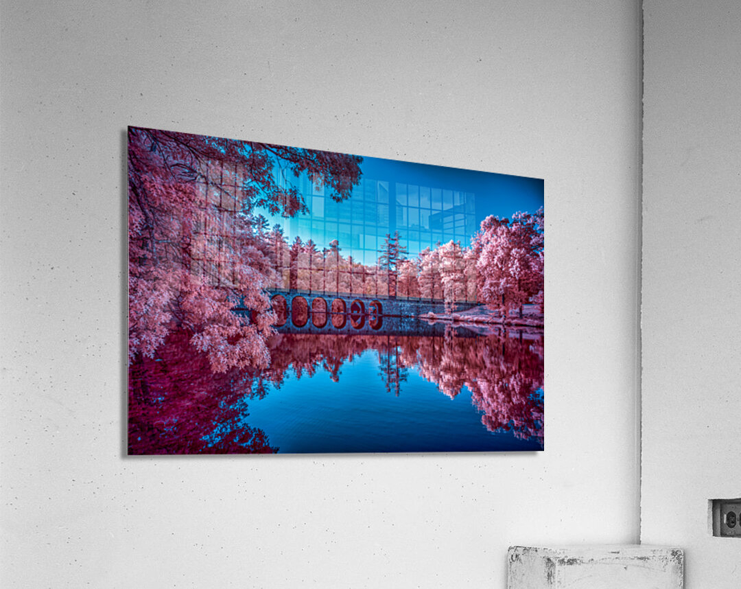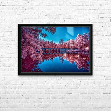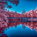 Embark on a vibrant journey through Cumberland Mountain State Park in Tennessee, where nature's palette transforms an ordinary stroll into a magical escapade. The color infrared image unfolds as a stone bridge gracefully spans a serene lake, a reflection of tranquility mirrored beneath its arches. The trees, bathed in enchanting pink hues, create a surreal symphony against the azure blue sky. Captured during a leisurely walk around the lake with my wife and our pup Cooper, the scene exudes a tranquil charm that envelops the senses. As we crossed the stone bridge, the vibrant colors of the infrared spectrum brought the landscape to life in a way that transcended the ordinary. The pink trees, a testament to the park's natural beauty, cast a captivating reflection in the lake, creating a mesmerizing dance of colors. This color infrared image narrates more than just a picturesque scene; it tells a story of a peaceful afternoon spent in the heart of Cumberland Mountain State Park. As Cooper wagged his tail in joy, the stone bridge became a symbolic gateway to a world where nature and companionship merge in a harmonious blend of serenity and vibrant beauty.