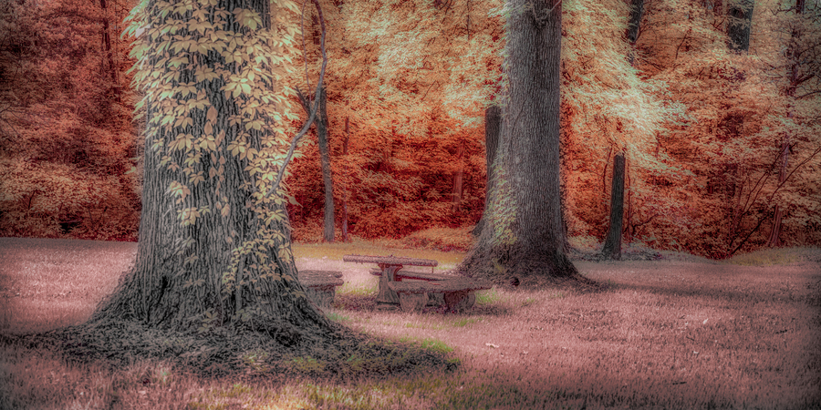 Embarking on a memorable visit to my aunt's charming home in Tennessee, I stumbled upon a scene of enchanting tranquility in her front yard. Nestled between two majestic trees partially veiled in ivy, a concrete patio table, and bench set beckoned with an allure that begged to be captured in the vibrant hues of color infrared photography. As I framed the shot, the image came alive with a surreal touch, transforming the familiar scene into a dreamy oasis. The color infrared lens cast a spell on the foliage, turning the leaves into a mesmerizing reddish-orange hue. The entire backyard landscape took on a magical quality, evoking a sense of wonder and relaxation. The concrete patio set stood as a centerpiece, bathed in the ethereal glow of color infrared. The dreamy atmosphere enhanced the inviting nature of the outdoor space, inviting thoughts of leisurely conversations and moments of quiet reflection beneath the canopy of the ivy-covered trees. The large trees, their branches reaching skyward, created a natural frame for the scene, adding to the overall charm of the backyard oasis. The interplay of light and shadow, accentuated by the color infrared lens, brought out the intricate details of the leaves and the texture of the concrete, creating a visual symphony that spoke to the beauty of outdoor relaxation. This unexpected discovery in my aunt's front yard became a highlight of my Tennessee visit, a testament to the magic that color infrared photography can weave into everyday moments. The dreamy ambiance of the patio set nestled between the trees and draped in ivy unveiled a hidden oasis, inviting all who witnessed it to bask in the surreal landscape of vibrant foliage and tranquil outdoor charm.
