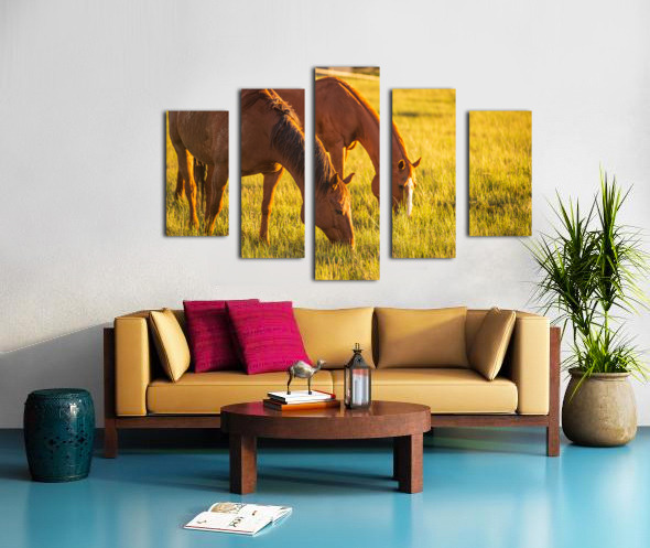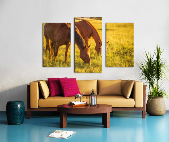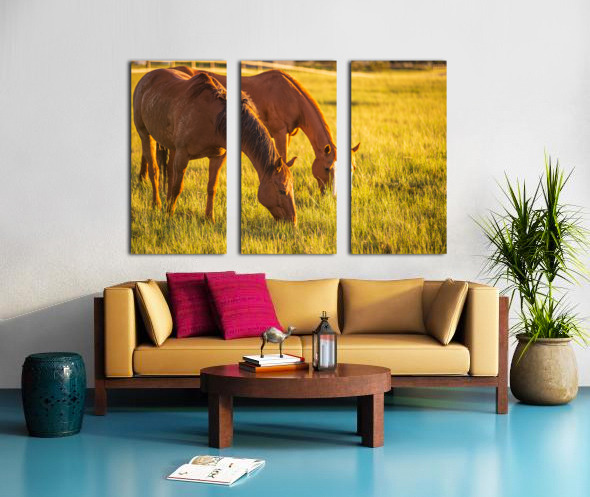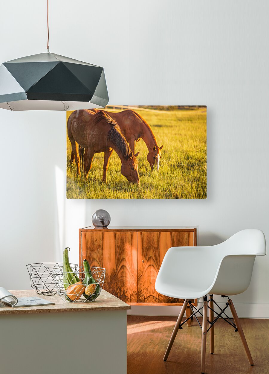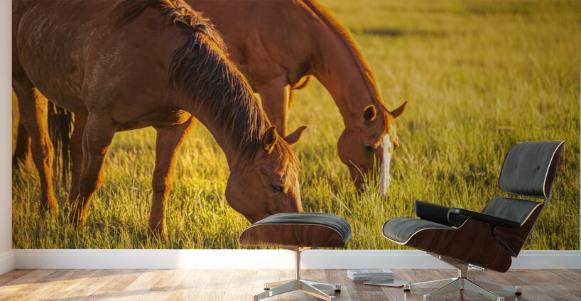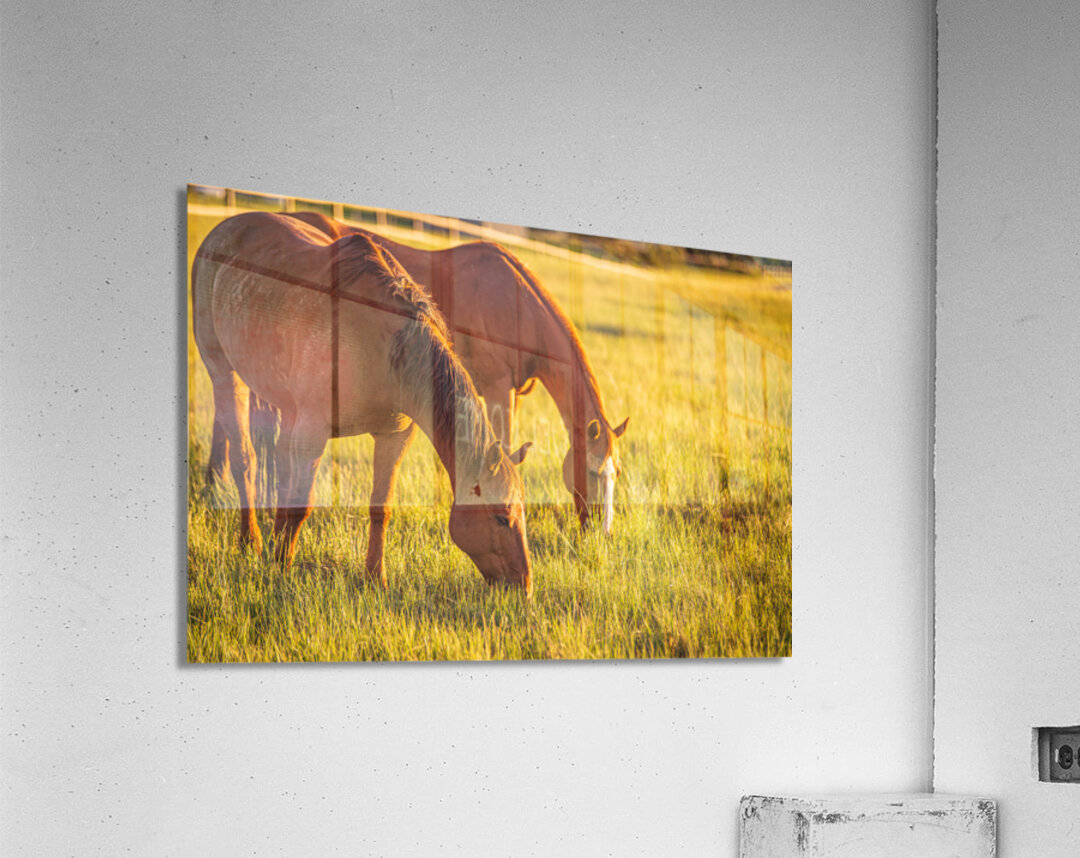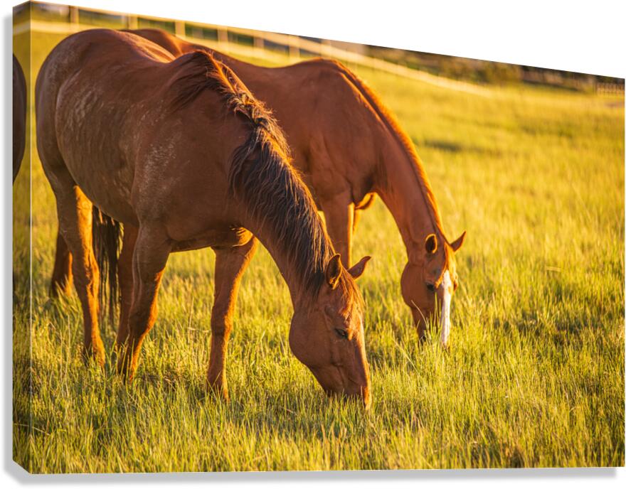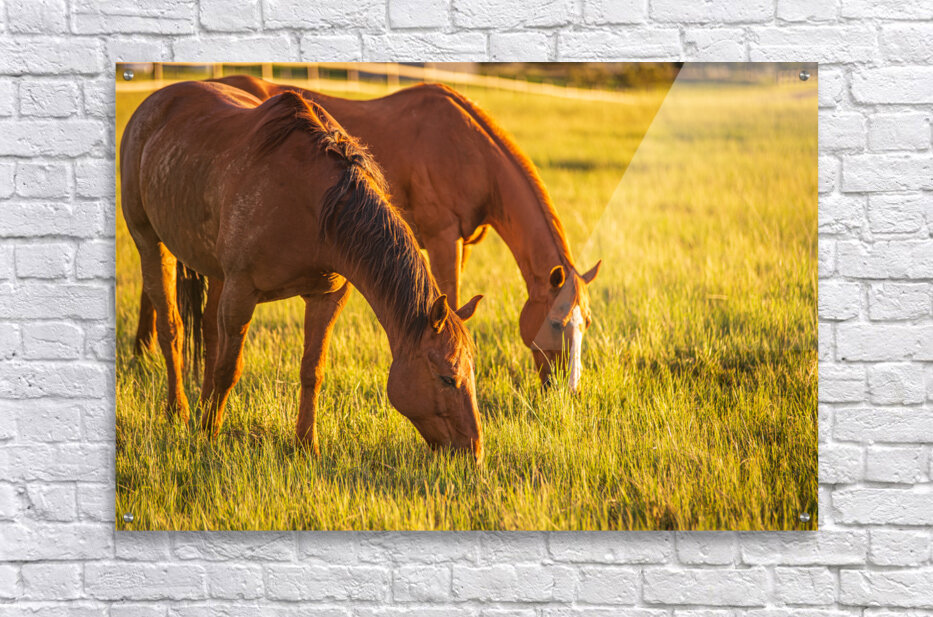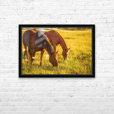 Enter into a realm of serene beauty and tranquility depicted in this captivating artwork, where two magnificent horses peacefully graze amidst lush green fields. Bathed in the soft golden glow of the sun, the scene exudes a sense of harmony and peace. With their tranquil demeanor and graceful posture, the horses emanate a quiet strength that enchants any observer. Set against the backdrop of a gently blurred fence that blends into the surroundings, the horses seem to inhabit a timeless and ethereal world. Through this mesmerizing piece, the artist skillfully captures the raw essence of nature, highlighting the majestic presence of these magnificent animals. The juxtaposition of the vibrant green grass against the warm golden sunlight creates a stunning visual spectacle that evokes both tranquility and wonder. The meticulous attention to detail in depicting the horses' anatomy and musculature reflects the artist's dedication and talent. Allow yourself to be transported to this enchanting place and experience the beauty and serenity emanating from this exquisite artwork. Immerse yourself in the tranquil atmosphere of the scene and let its peaceful vibes envelop you. With its captivating charm, this stunning piece is sure to bring a sense of calm and joy to any space it adorns.