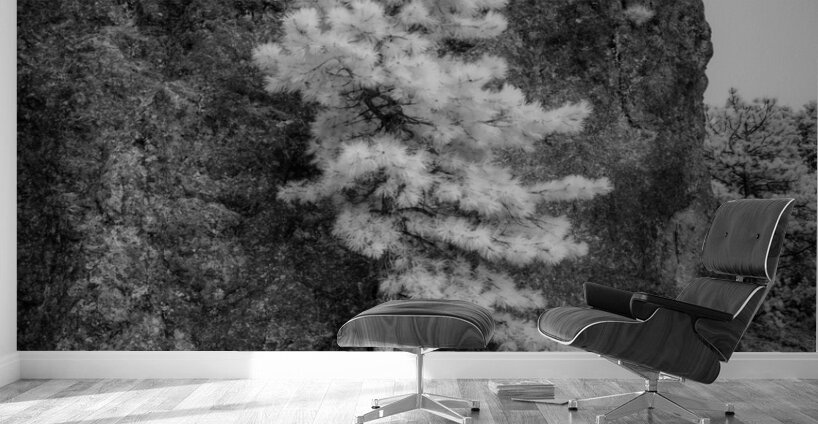 An invsible light image of a pine tree standing tall against a massive rock formation. It looks like the tree is holdin up the rock.