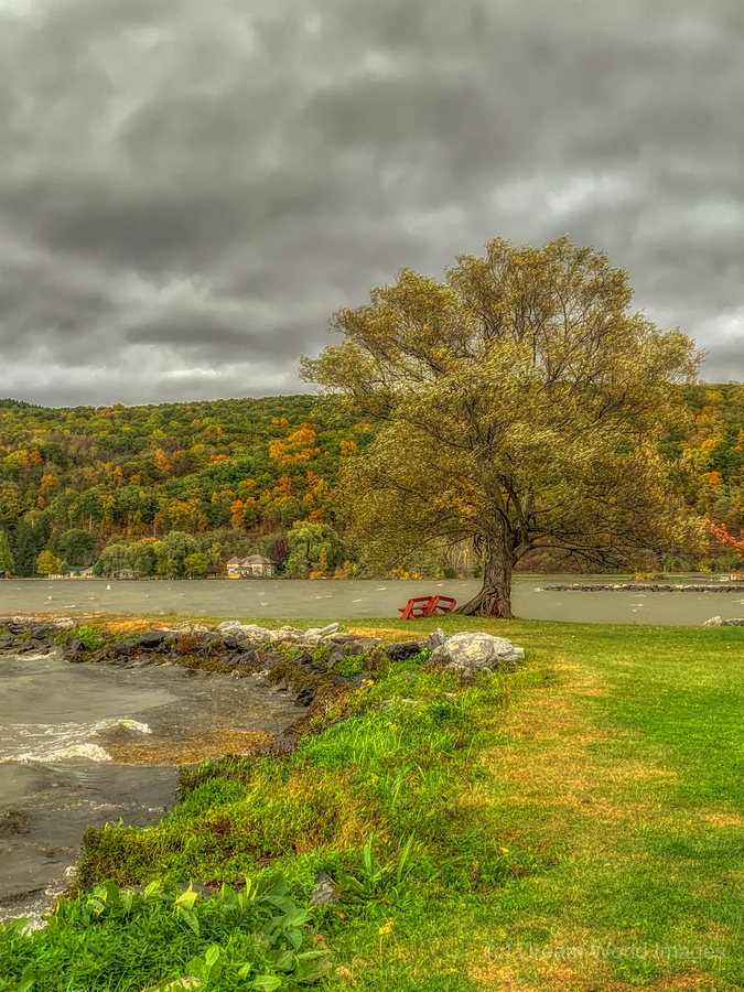 Stormy shore at Lake Seneca in Watkins Glen New York in October with autumn leaves