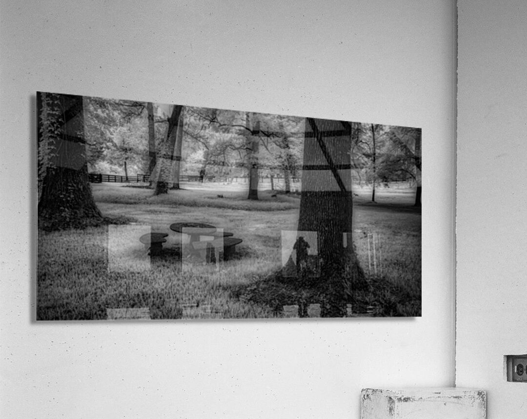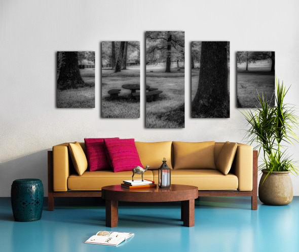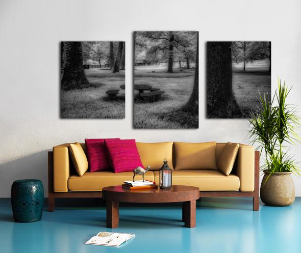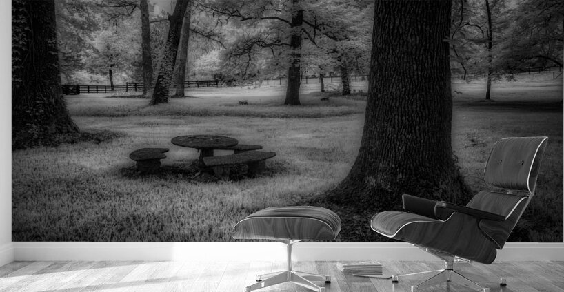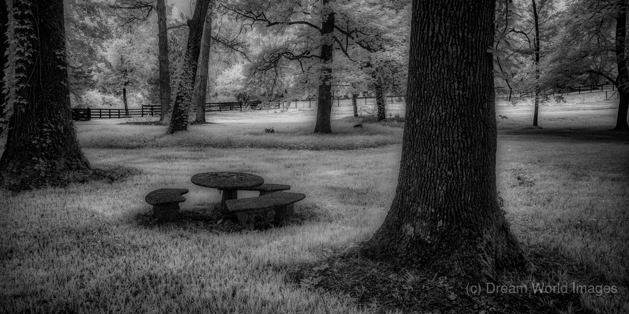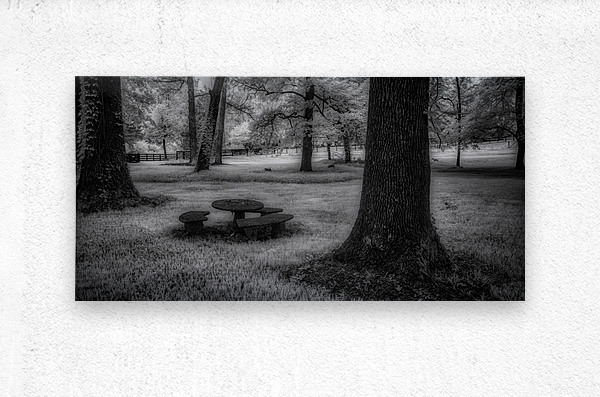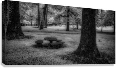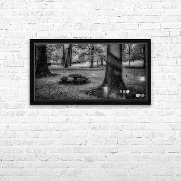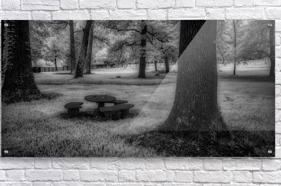 Where ancient oaks stand guard over memories, a solitary picnic table rests in nature's quiet embrace. Through monochromatic artistry, this everyd...[+]