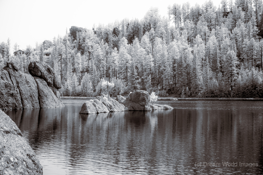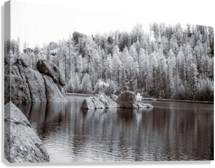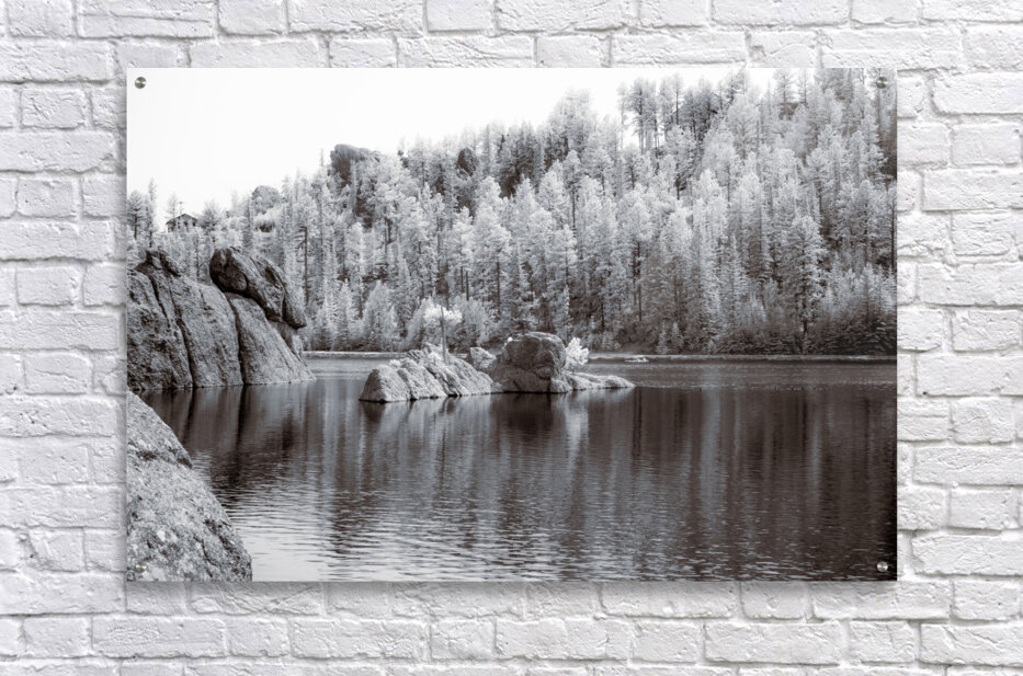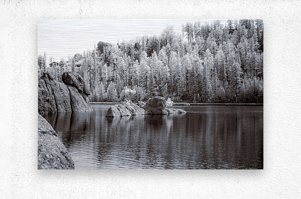 On a recent adventure, we found ourselves hiking around the stunning Sylvan Lake in Custer, South Dakota, on a bright but overcast day. Despite the cloud cover, the beauty of the landscape shone through, making it one of my favorite stops on our travels. As we meandered along the trail, I couldn't help but marvel at the photographic opportunities that presented themselves at every turn. Each corner revealed a new vista to capture and cherish. One particularly memorable scene caught my eye—a small rock island nestled in the lake's tranquil waters, adorned with two majestic pine trees. The simplicity and serenity of the scene drew me in, and I knew I had to capture it with my camera. Opting for black-and-white infrared photography, I aimed to immortalize the timeless beauty of the landscape. As I snapped the photo, I couldn't help but notice a faint haze in the sky, a reminder of the distant wildfires raging in Canada. Despite the haze, the image perfectly captured Sylvan Lake's essence—the pristine waters, the rugged shoreline, and the towering pine trees standing tall against the horizon. As we continued our hike, I carried the memory of that serene moment with me, grateful for the opportunity to explore such a breathtaking destination and capture its beauty through my lens.