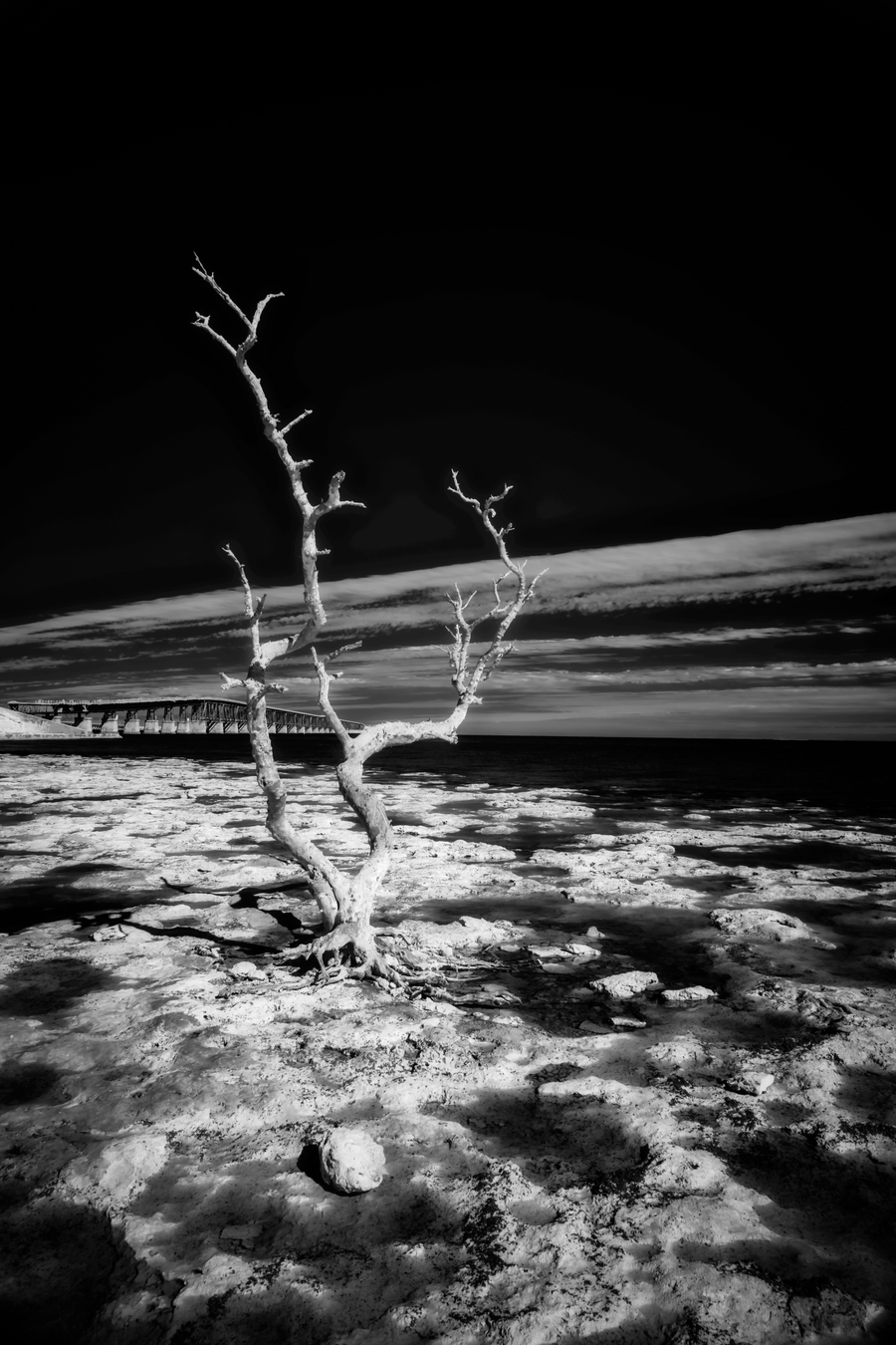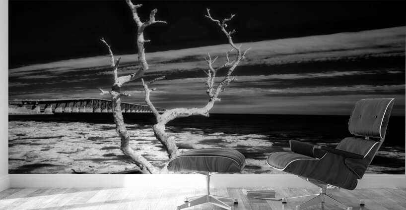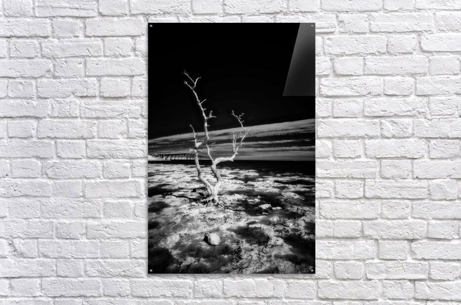Embark on a journey through the enchanting Florida Keys, where every turn reveals hidden treasures. One such discovery led us to a spot forever known as "Hey Key." In this moment, my wife, our faithful companion Cooper, and I stumbled upon a stretch of coastline adorned with hauntingly beautiful dead trees during low tide. Capturing the essence of this fleeting moment, the black and white infrared image titled "Hey Key Silhouette" immerses you in a world of stark contrasts. The dead tree, dramatically highlighted by the sun's gentle caress, stands proudly against the dark canvas of the infrared sky. In the background, the faint silhouette of a bridge adds an intriguing touch to this captivating scene. A whimsical tale accompanies this image, as "Hey Key" was christened during a humorous exchange – a testament to the joy and spontaneity of our explorations in the Florida Keys.