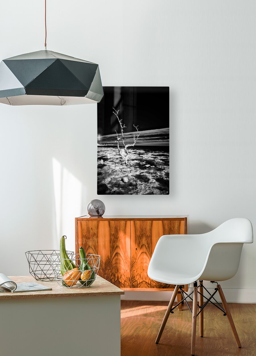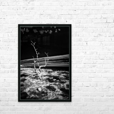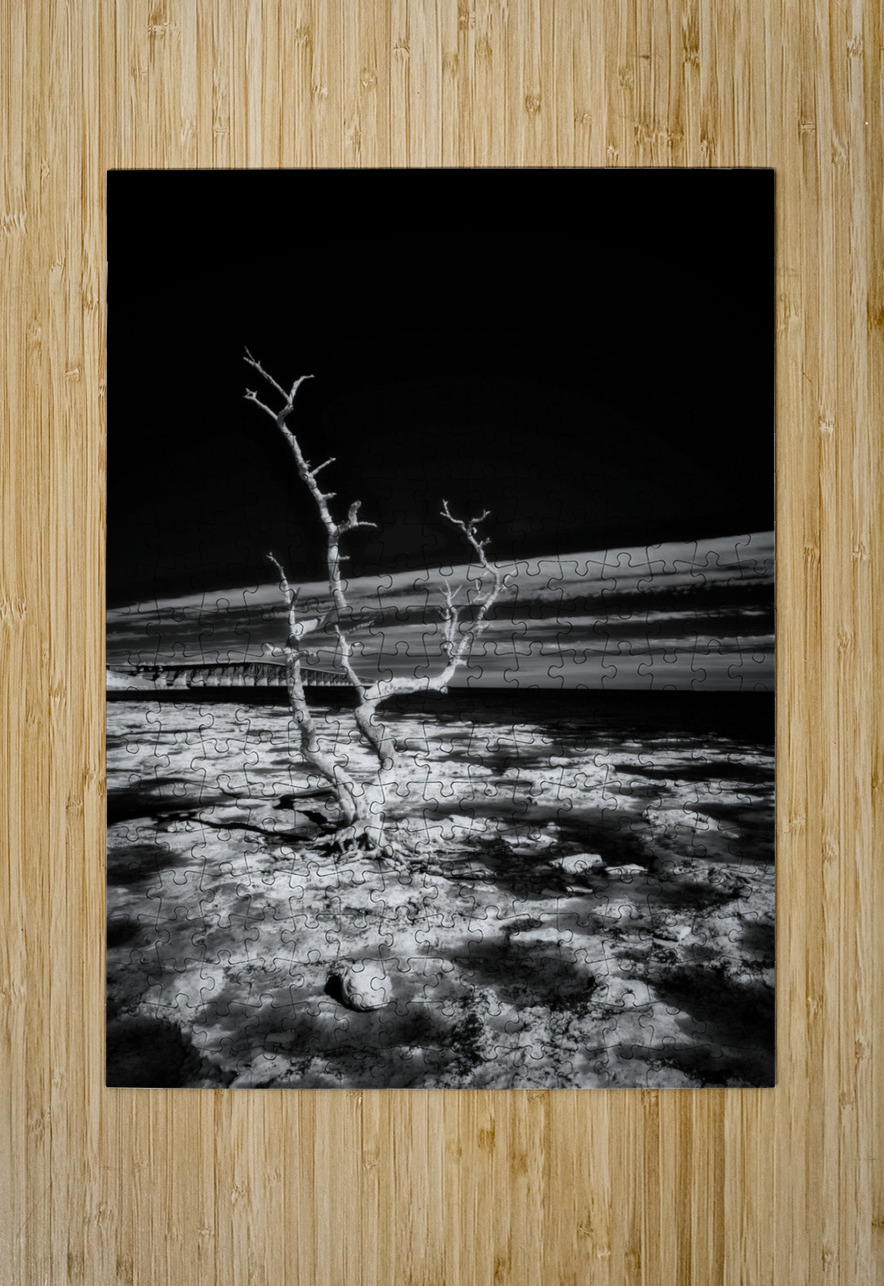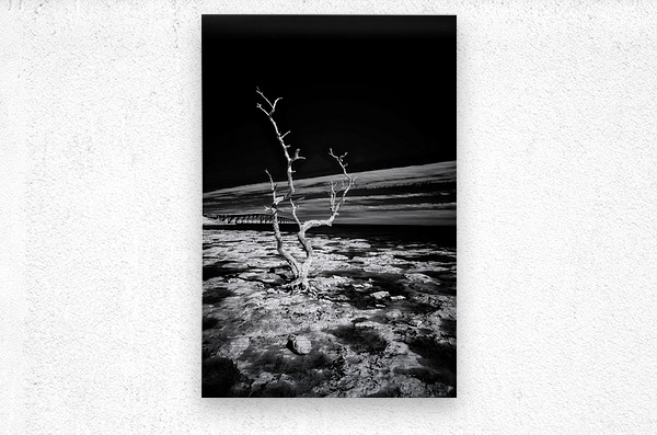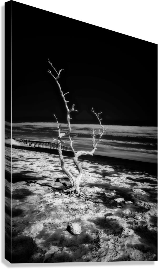 Embark on a journey through the enchanting Florida Keys, where every turn reveals hidden treasures. One such discovery led us to a spot forever known as "Hey Key." In this moment, my wife, our faithful companion Cooper, and I stumbled upon a stretch of coastline adorned with hauntingly beautiful dead trees during low tide. Capturing the essence of this fleeting moment, the black and white infrared image titled "Hey Key Silhouette" immerses you in a world of stark contrasts. The dead tree, dramatically highlighted by the sun's gentle caress, stands proudly against the dark canvas of the infrared sky. In the background, the faint silhouette of a bridge adds an intriguing touch to this captivating scene. A whimsical tale accompanies this image, as "Hey Key" was christened during a humorous exchange – a testament to the joy and spontaneity of our explorations in the Florida Keys.
