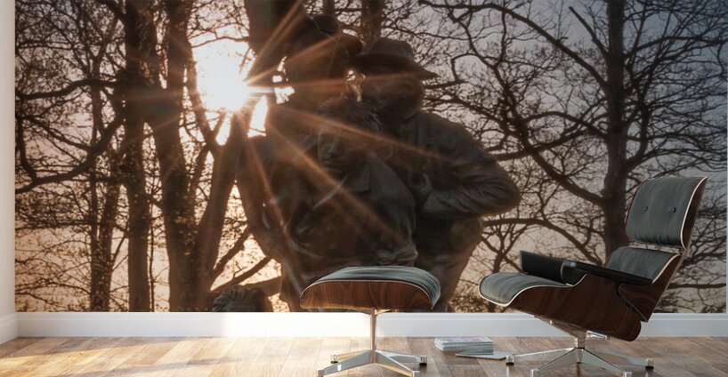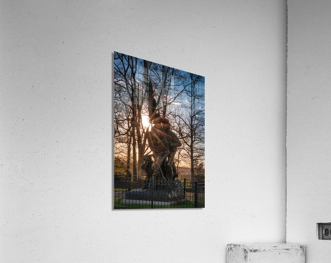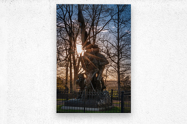 Step into a world of valor and resilience with this captivating artwork titled "Stand Together, Move Forward." The bronze statue stands tall, depicting a group of military figures united in solidarity against all odds. The intricate details of their uniforms and expressions convey a sense of camaraderie and unwavering determination. As the sun casts its warm glow over the scene, the figures come to life, seemingly ready to take on any challenge that comes their way. The play of light and shadows adds depth and dimension to the sculpture, enhancing its powerful presence. Surrounded by a sturdy metal fence, the artwork stands as a symbol of strength and protection amidst lush trees and an expansive sky. The juxtaposition of the figures against the natural elements creates a striking contrast, emphasizing the bravery and companionship depicted in the piece. Experience the beauty and poignancy of this stunning artwork, where valor and unity reign supreme. Each viewing offers a new perspective, inviting viewers to reflect on the resilience and sacrifice of those who stand together in the face of adversity. "Stand Together, Move Forward" is a testament to the human spirit and an homage to the unbreakable bond forged through shared experiences.