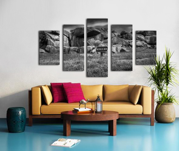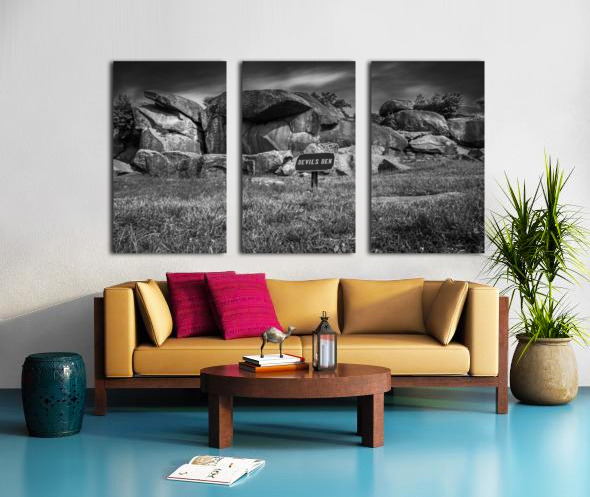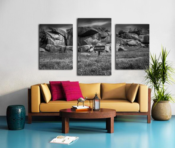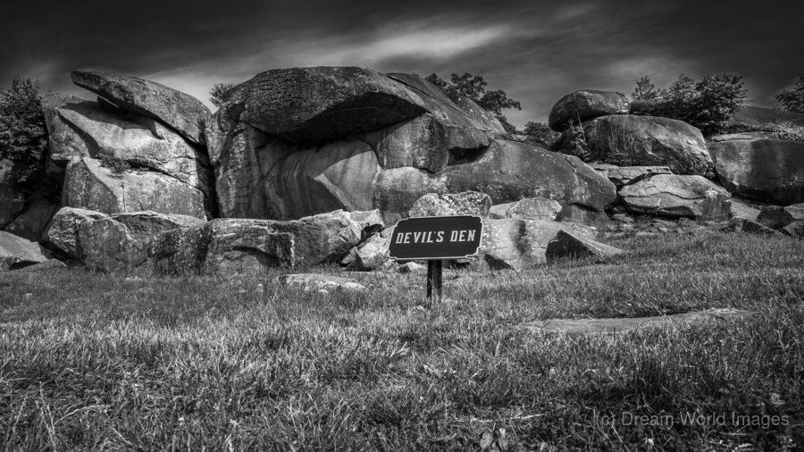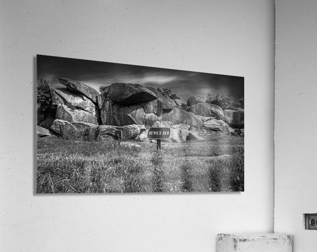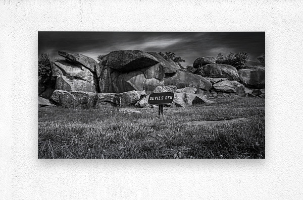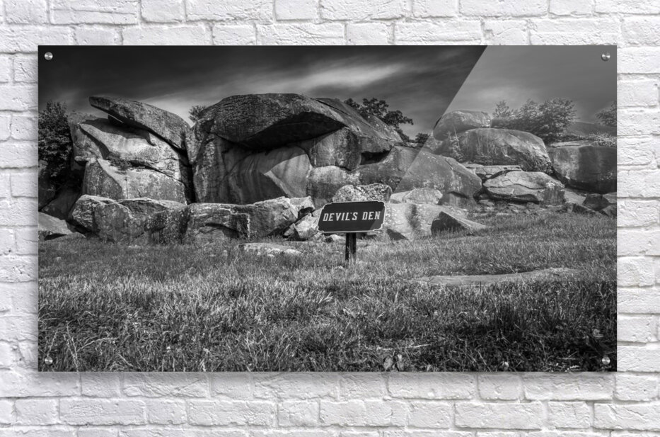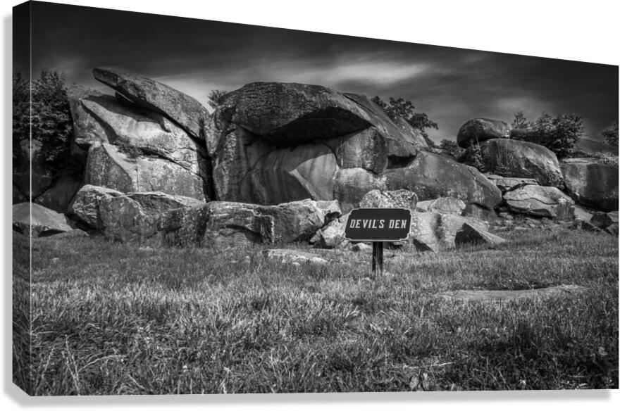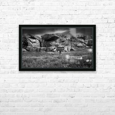 Embark on an unforgettable journey to Devil's Den in Gettysburg with "Majestic Monoliths," a captivating black and white landscape photograph that immerses you in a world of ancient rocks and captivating landscapes. As you venture into this realm of intrigue, you'll encounter towering boulders that have endured the test of time, standing proudly amidst a rugged terrain like silent guardians, their weathered surfaces whispering tales of centuries past. These majestic monoliths invite contemplation and introspection, their jagged silhouettes casting dramatic shadows against the backdrop of the sky. The interplay of light and shadow creates a mesmerizing contrast, highlighting the untamed beauty of nature in its purest form. Above, the brooding sky adds an air of mystery, igniting the imagination and prompting reflections on the mysteries within. The sign bearing the ominous words "DEVIL'S DEN" only deepens the enigma surrounding this place, hinting at ancient secrets waiting to be unearthed. With its striking composition and haunting allure, "Majestic Monoliths" urges you to explore further, to unravel the mysteries concealed within the rugged landscape and unlock the secrets of bygone eras.