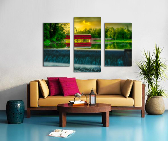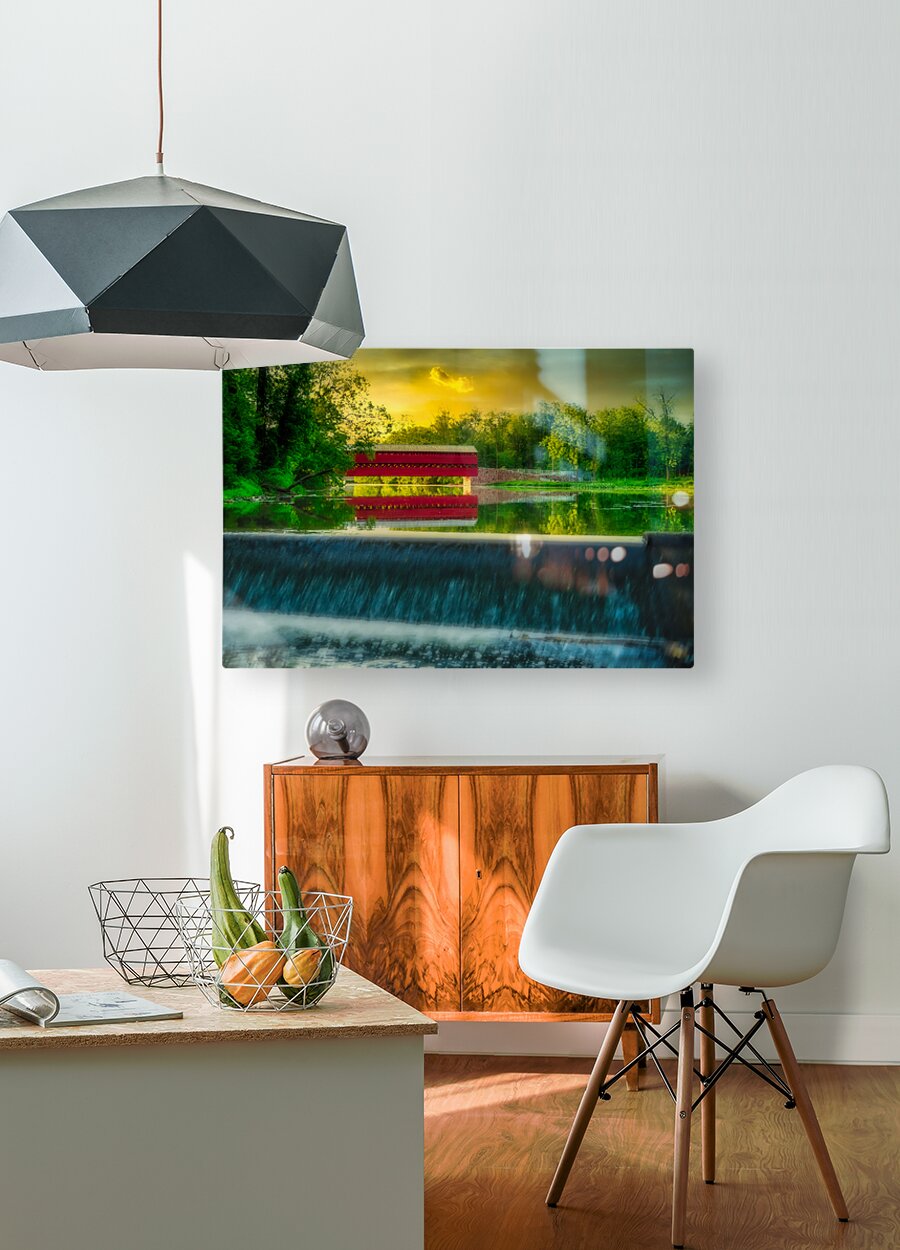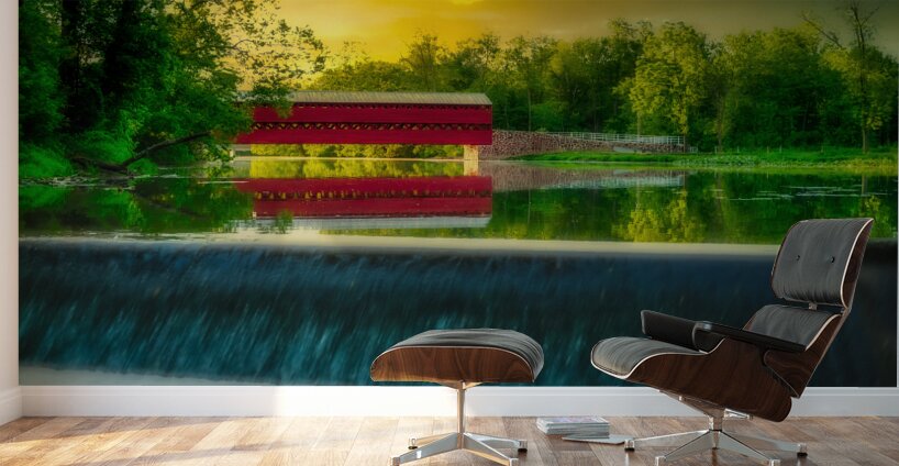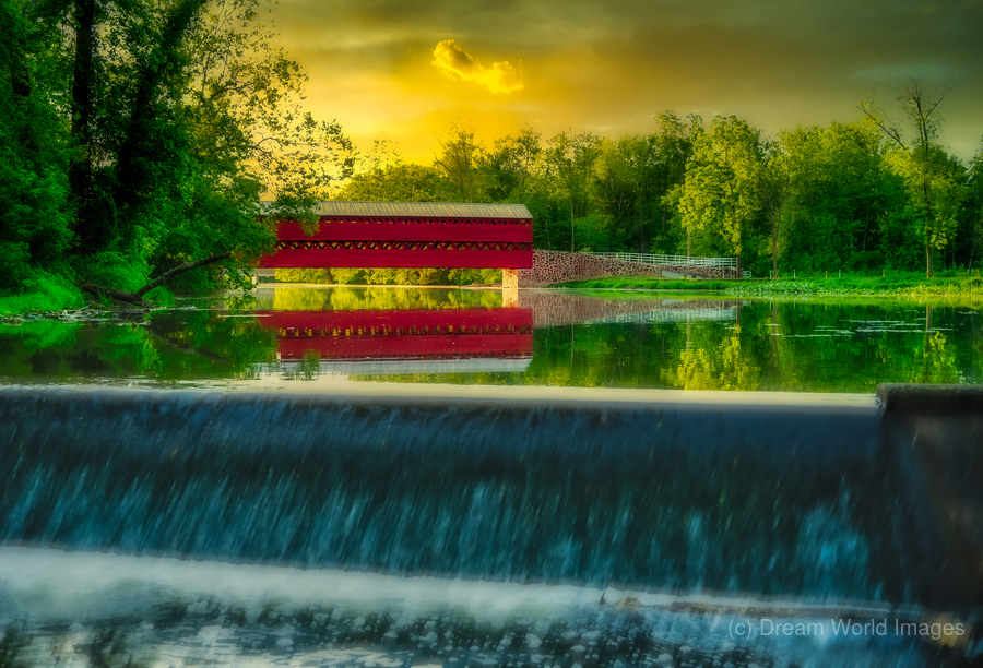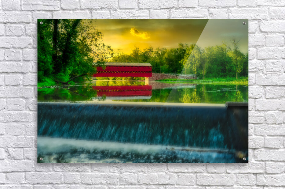 Step into a world of serene beauty and tranquility with "Tranquil Reflections," a captivating artwork that transports viewers to the idyllic Sachs Bridge in Gettysburg, Pennsylvania, bathed in the warm glow of sunset. This stunning image captures the essence of peace and serenity, inviting viewers to immerse themselves in the tranquil atmosphere of the rural setting. As the sun dips below the horizon, casting a golden hue across the landscape, Sachs Bridge stands as a majestic focal point, its charming red structure contrasting beautifully against the verdant surroundings. The gentle cascade of a nearby waterfall adds to the enchanting scene, imbuing it with a sense of timeless beauty and tranquility. Surrounded by lush greenery, Sachs Bridge exudes warmth and serenity, inviting viewers to linger and soak in the natural splendor of their surroundings. The dramatic sky, painted in orange, pink, and purple hues, serves as a stunning backdrop to the scene, enhancing its beauty and adding depth and contrast. As viewers gaze upon the breathtaking scenery before them, they are invited to pause and reflect on the beauty of nature and the timeless charm of Sachs Bridge. This captivating artwork is a reminder to slow down, appreciate the simple pleasures in life, and find solace in the tranquility of the natural world.