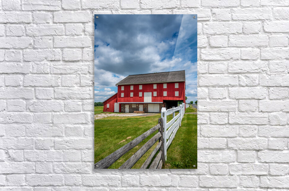 Capturing the essence of rural charm, behold the iconic Sherfy red barn against a picturesque backdrop in Gettysburg, Pennsylvania. This striking photograph showcases the barn's majestic presence, with its white-trimmed windows and lush greenery crowning its pitched roof. A weathered wooden fence leads the viewer's gaze towards the barn, evoking a sense of pastoral tranquility. Set against a dynamic sky painted with streaks of white and gray clouds, the scene exudes a timeless allure. The surrounding landscape, a mix of grassy patches and bare ground, hints at the rustic beauty of a working farm environment. The photograph extends to reveal a winding road bordered by additional fencing, adding depth and perspective to the rural setting along Emmitsburg Road. Experience the serenity and nostalgia of countryside living captured in this captivating image, where history and natural beauty converge in a breathtaking display. Explore the Sherfy red barn and its surroundings, and immerse yourself in the tranquil charm of rural Gettysburg, Pennsylvania. Immerse yourself in the tranquility of the countryside with this stunning photograph capturing the beauty of the Sherfy Barn along the Emmitsburg Road in Gettysburg, PA. The striking red barn with white trim stands out against the backdrop of a serene blue sky streaked with fluffy clouds, creating a picturesque scene that exudes peace and rural charm. The lush greenery on the roof, the symmetrical white-trimmed windows, and the weathered wooden fence all add to the rustic beauty of this peaceful setting. Let this artwork transport you to a place of serenity and tranquility, where the simple joys of country living can be appreciated.