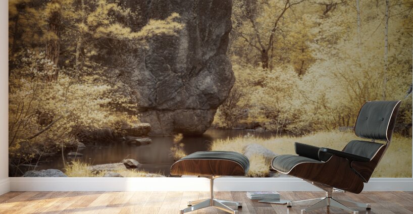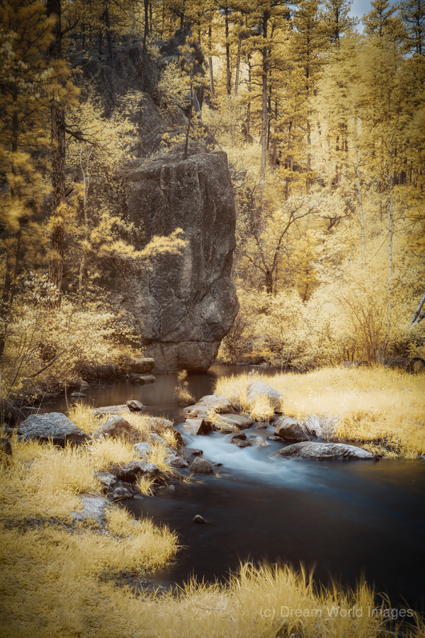 Embarking on a soul-soothing trek up Grace Coolidge Creek in the heart of South Dakota I immersed myself in a landscape transformed by the enchanting glow of infrared hues. The scene captured in a mesmerizing image reveals a yellow-tinted world where trees and foliage dance harmoniously. Grace Coolidge Creek a natural masterpiece takes center stage as it gracefully cascades around a massive boulder embracing a small batch of rocks before settling into a calm pool. The journey up this serene creek becomes a visual feast for the senses with the warm yellow hues of the infrared palette casting a unique spell on the surroundings. The gentle cascade of water adds a melodic soundtrack to the tranquil stroll inviting visitors to revel in the beauty of South Dakotas natural wonders. The image invites you to join me on this immersive adventure where Serenity Unveiled along Grace Coolidge Creek unfolds in the warm embrace of infrared beauty. Whether youre a seasoned hiker nature enthusiast or simply seeking a moment of calm this journey captures the timeless allure of one of South Dakotas hidden gems.