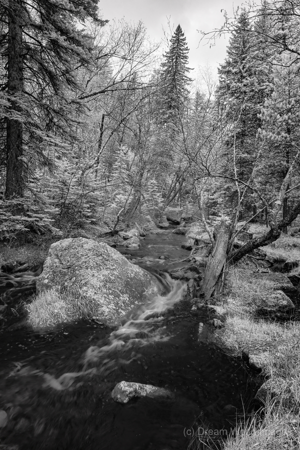 Embarking on a scenic hike through Custer State Park in South Dakota my journey along Grace Coolidge Creek unveiled a world of monochromatic wonder. In the mystique of black and white infrared two captivating images captured the essence of a small waterfall cascading over a series of rocks—a scene both enchanting and timeless. The horizontal frame a visual symphony of flowing water and textured rocks draws you into the rhythmic dance of the cascades. In this monochromatic embrace the beauty of nature unfolds in layers creating a captivating tableau that transcends the ordinary. The vertical composition a dramatic portrayal of the same enchanting scene emphasizes the height and grace of the cascading waterfall. The interplay of light and shadows enhanced by the infrared lens adds an ethereal quality to the landscape inviting viewers to experience the magic of Grace Coolidge Creek in a unique perspective. The image invites you to explore the monochromatic serenity of Custer State Park where black and white infrared photography brings to life the enchanting cascades along Grace Coolidge Creek. Whether youre drawn to horizontal or vertical compositions these images capture the timeless allure of natures wonders in the heart of South Dakota.