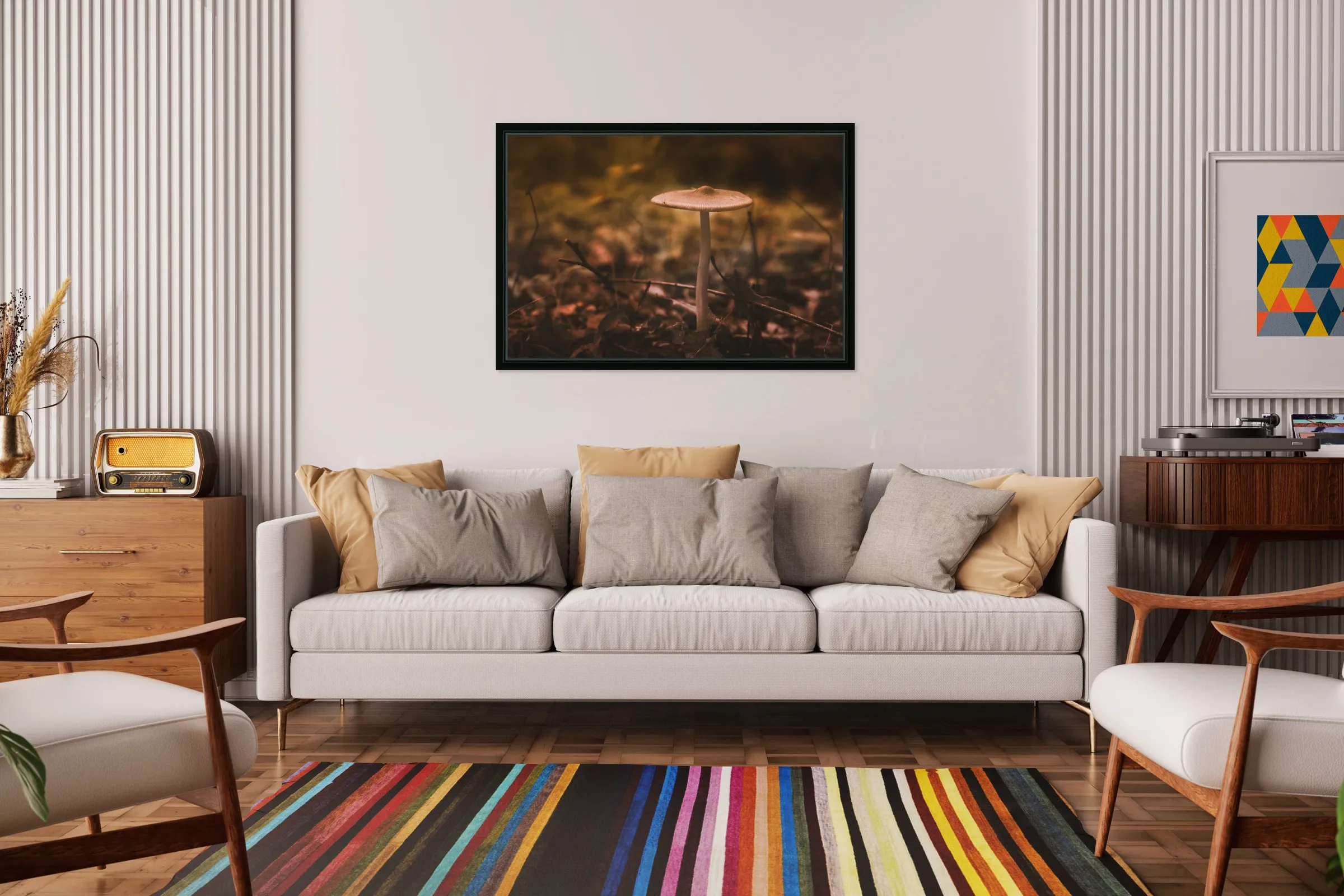 Get this artwork "Mystical Fungi: Pale Amidst Sun-Dappled Leaves" in a framed print.