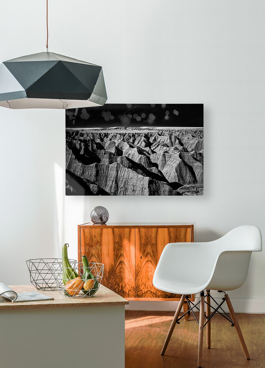 Embark on an unforgettable adventure as my wife and I journeyed through the captivating landscapes of the Badlands in South Dakota. Witness the breathtaking beauty of this rugged terrain where every shadow tells a story of mystery and intrigue. Step into a world where the shadows dance across the rugged earth revealing a landscape shrouded in enigma. The realm of sharply ridged hills and deep valleys is illuminated by a captivating play of light and shadow bringing texture and depth to every crevice. The horizon stretches endlessly beckoning the viewer to explore beyond the intricate patterns carved into the earth. In a black and white photograph that captures the essence of the lands ancient soul this artwork invites you to lose yourself in the Shadows of the Earth.