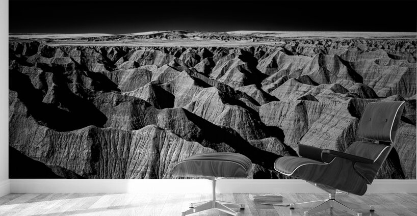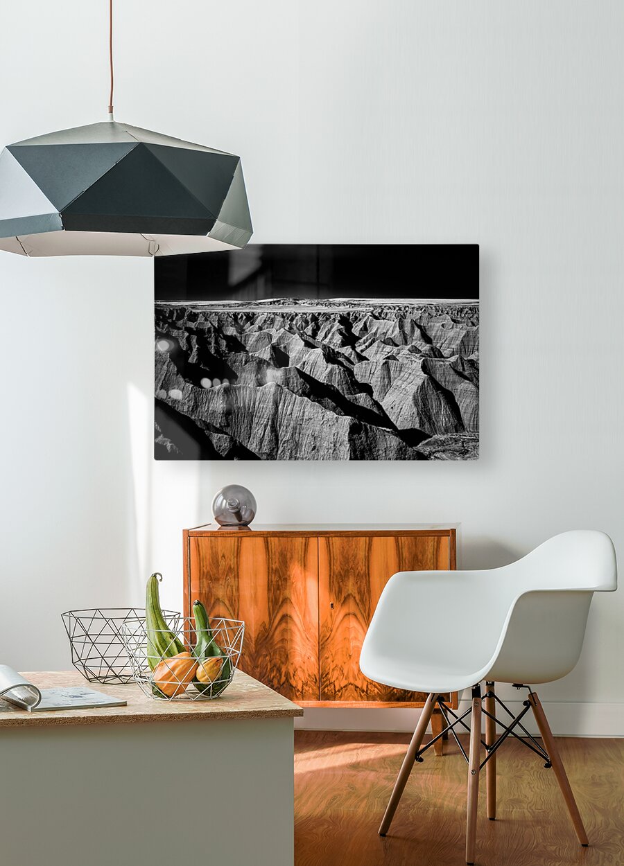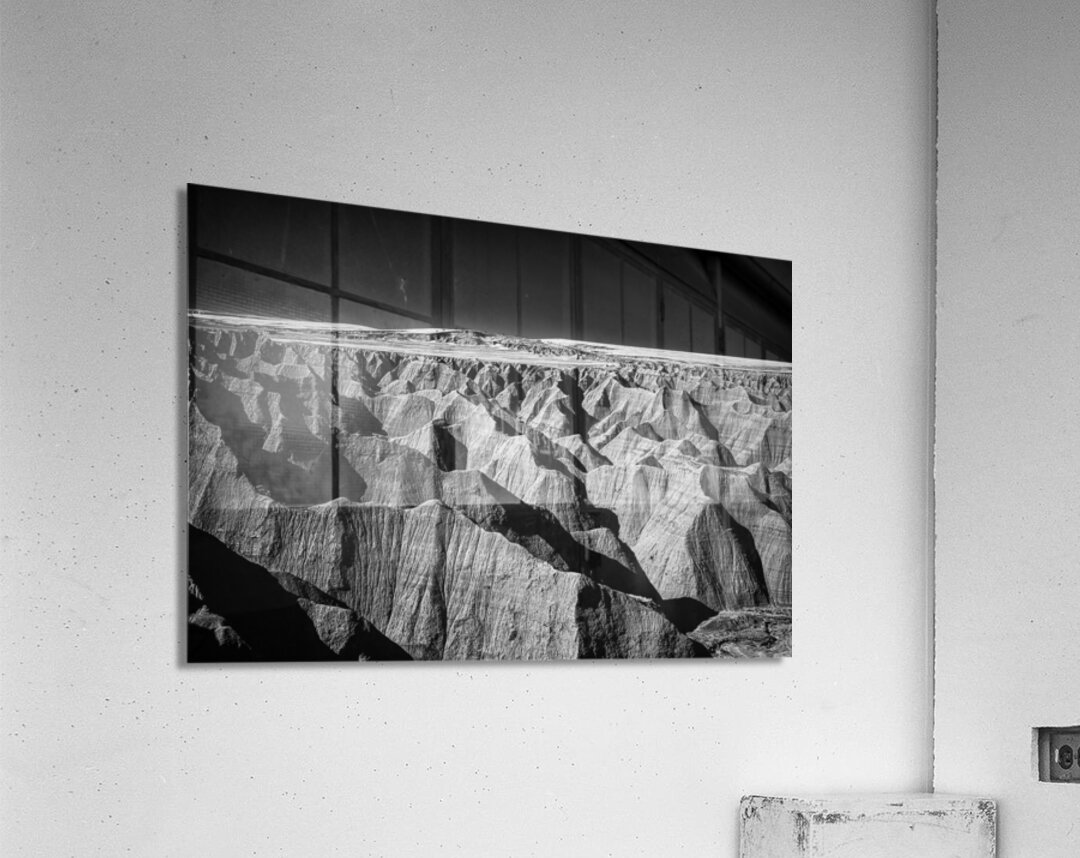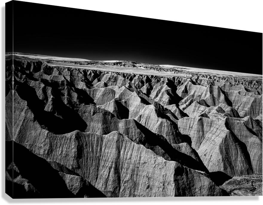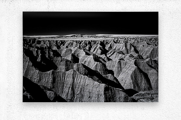 Embark on an unforgettable adventure as my wife and I journeyed through the captivating landscapes of the Badlands in South Dakota. Witness the breathtaking beauty of this rugged terrain where every shadow tells a story of mystery and intrigue. Step into a world where the shadows dance across the rugged earth revealing a landscape shrouded in enigma. The realm of sharply ridged hills and deep valleys is illuminated by a captivating play of light and shadow bringing texture and depth to every crevice. The horizon stretches endlessly beckoning the viewer to explore beyond the intricate patterns carved into the earth. In a black and white photograph that captures the essence of the lands ancient soul this artwork invites you to lose yourself in the Shadows of the Earth.