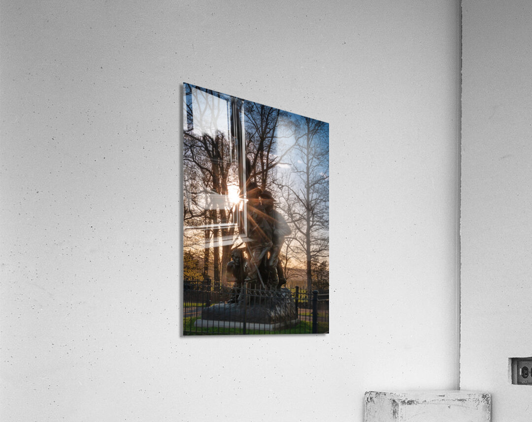Step into a world of valor and resilience with this captivating artwork titled Stand Together Move Forward. The bronze statue stands tall depicting a group of military figures united in solidarity against all odds. The intricate details of their uniforms and expressions convey a sense of camaraderie and unwavering determination. As the sun casts its warm glow over the scene the figures come to life seemingly ready to take on any challenge that comes their way. The play of light and shadows adds depth and dimension to the sculpture enhancing its powerful presence. Surrounded by a sturdy metal fence the artwork stands as a symbol of strength and protection amidst lush trees and an expansive sky. The juxtaposition of the figures against the natural elements creates a striking contrast emphasizing the bravery and companionship depicted in the piece. Experience the beauty and poignancy of this stunning artwork where valor and unity reign supreme. Each viewing offers a new perspective inviting viewers to reflect on the resilience and sacrifice of those who stand together in the face of adversity. Stand Together Move Forward is a testament to the human spirit and an homage to the unbreakable bond forged through shared experiences.