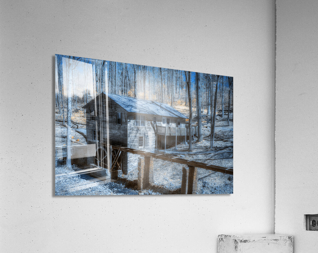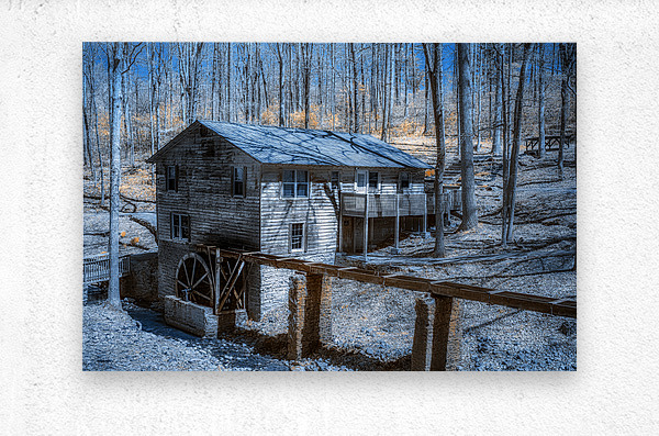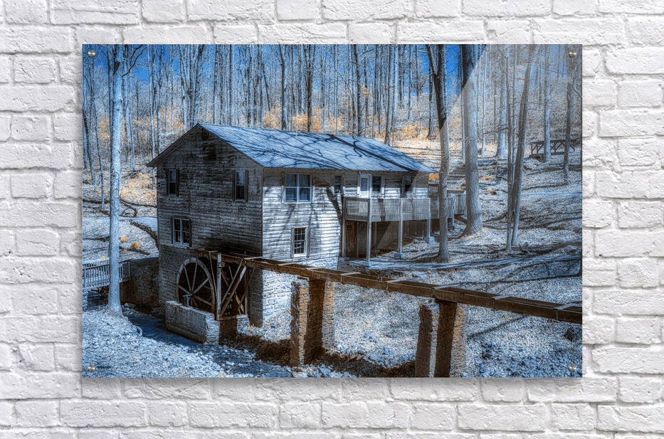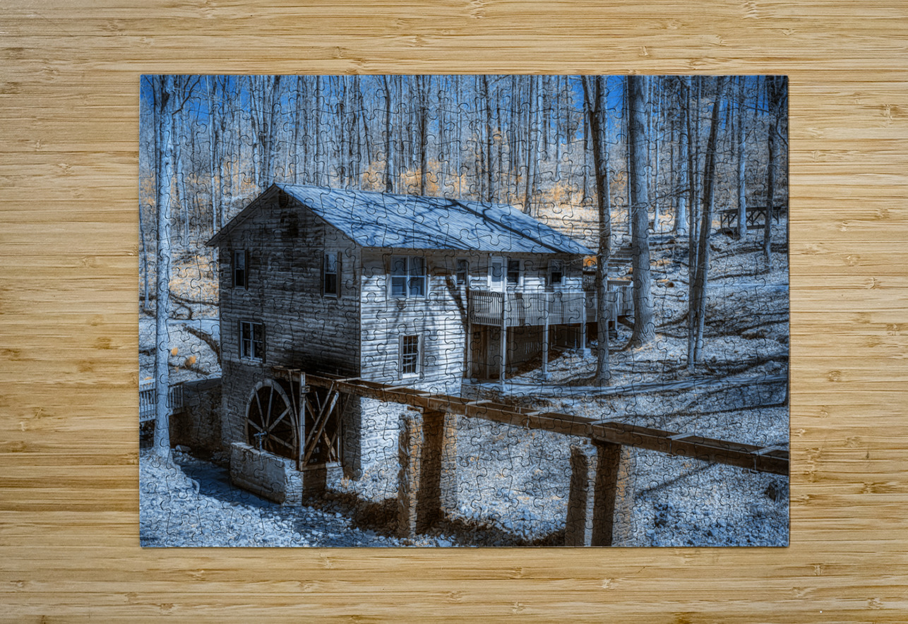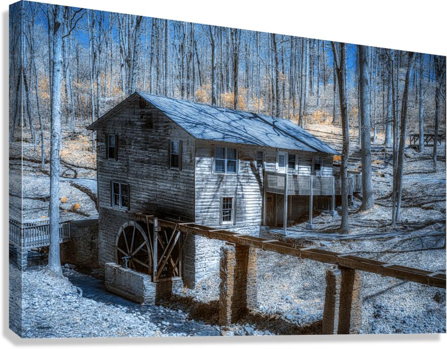 As I venture to Clarkson Covered Bridge in Cullman Alabama I find myself transported back in time to a place of wonder and history. Before me stands an old wooden mill its weathered siding and slanted metal roof catching the sunlight in a dance of light and shadow. The mill a true marvel is a sight to behold. Its prominent waterwheel a testament to human ingenuity is attached to a sturdy stone foundation. A wooden trough extends from the wheel directing water with purpose. The balconies and windows that grace the upper levels each with its own story to tell add to the mills rustic charm. Enveloping the mill is a serene forest terrain captured in a spectral blue tone that lends a tranquil otherworldly quality to the scene. The ground delicately dusted with fresh snow enhances the ethereal atmosphere. Despite the coolness of the blue filter the warmth of the mill radiates beckoning me closer with its timeless allure. As I soak in the serene atmosphere I cant help but appreciate the attention to detail in the photograph. The lighting accentuates the texture of the mills wooden surfaces and the rough stonework adding depth to the image. Its a journey back in time a glimpse into a bygone era preserved in the beauty of Clarkson Covered Bridge.