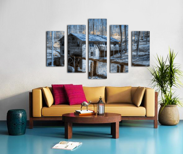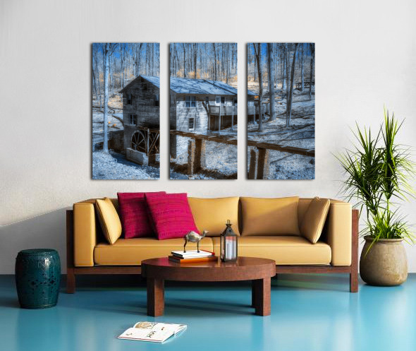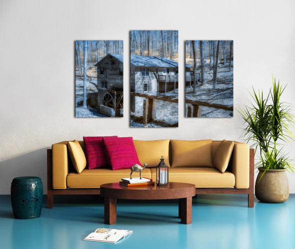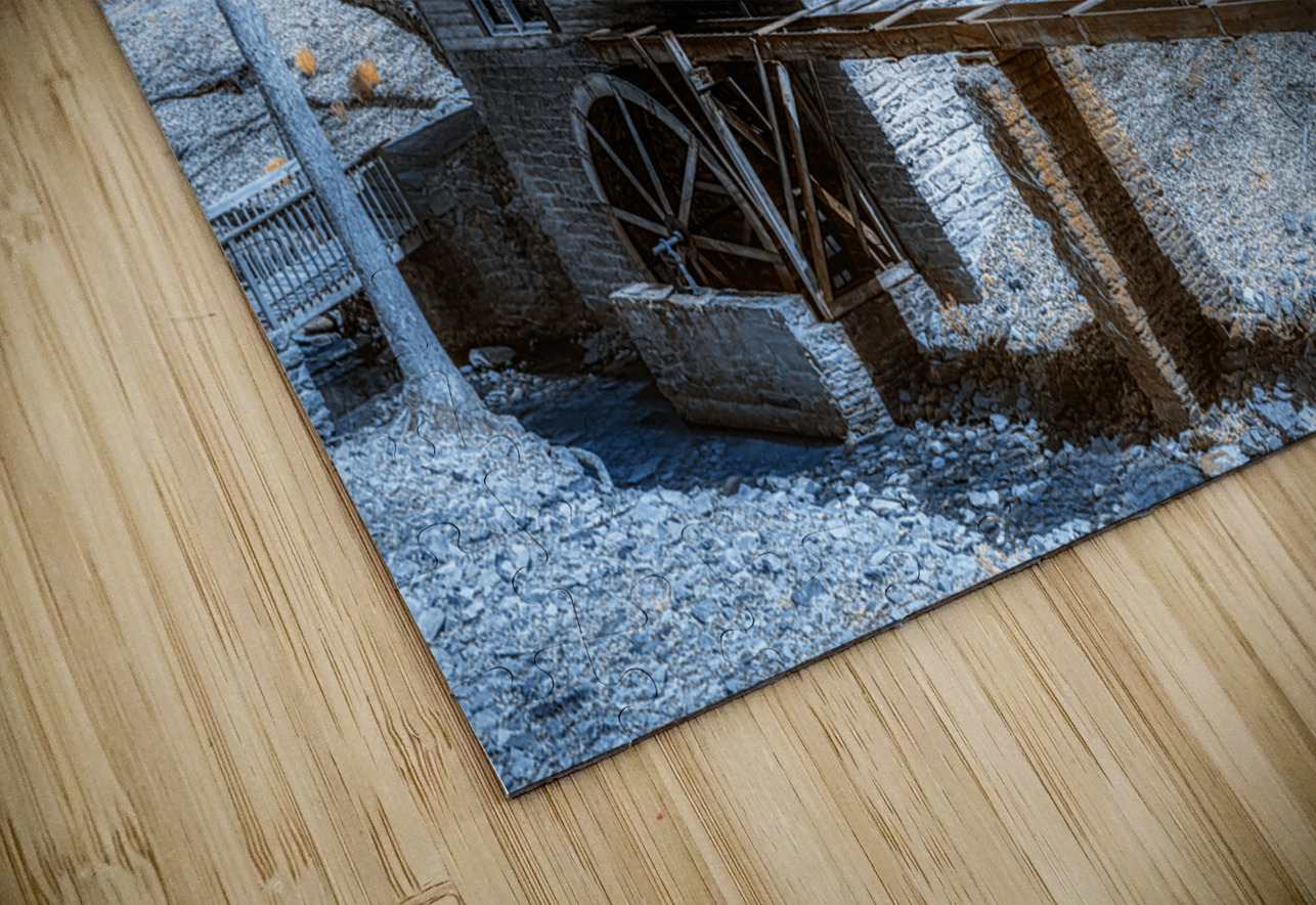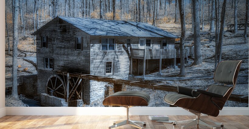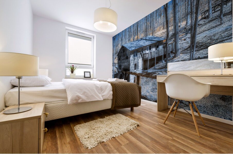 As I venture to Clarkson Covered Bridge in Cullman Alabama I find myself transported back in time to a place of wonder and history. Before me stands an old wooden mill its weathered siding and slanted metal roof catching the sunlight in a dance of light and shadow. The mill a true marvel is a sight to behold. Its prominent waterwheel a testament to human ingenuity is attached to a sturdy stone foundation. A wooden trough extends from the wheel directing water with purpose. The balconies and windows that grace the upper levels each with its own story to tell add to the mills rustic charm. Enveloping the mill is a serene forest terrain captured in a spectral blue tone that lends a tranquil otherworldly quality to the scene. The ground delicately dusted with fresh snow enhances the ethereal atmosphere. Despite the coolness of the blue filter the warmth of the mill radiates beckoning me closer with its timeless allure. As I soak in the serene atmosphere I cant help but appreciate the attention to detail in the photograph. The lighting accentuates the texture of the mills wooden surfaces and the rough stonework adding depth to the image. Its a journey back in time a glimpse into a bygone era preserved in the beauty of Clarkson Covered Bridge.