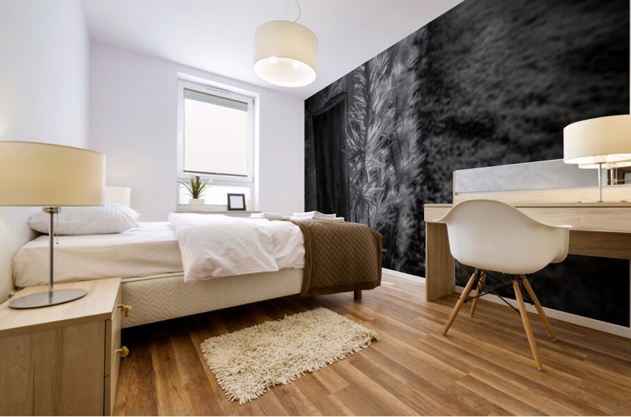 Enter the world of Luminous Intricacy where the ethereal beauty of nature is captured in a mesmerizing black-and-white photograph. A segment of a bamboo-like plant takes center stage its intricate details illuminated by a soft otherworldly glow. The delicate patterns of the leaves are brought to life in stunning clarity drawing the viewer into a realm of serenity and enchantment. In the background feathery plants dance in the light creating a hazy mysterious atmosphere that adds to the magical allure of the scene. This captivating artwork invites you to explore the depths of natures intricacy and find beauty in the simplest forms.