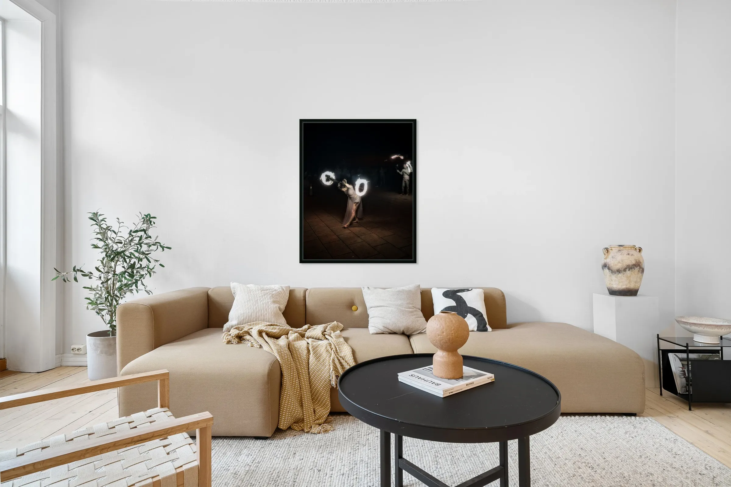 Whirls of Fire is an enchanting and dynamic creation that captures the essence of a mesmerizing fire-dancing performance. In the foreground lies a performer adorned in a flowing ethereal outfit their movements both fluid and captivating. They twirl fire poi with such grace that it seems as though they command the very flames to dance in unity with them. These glowing orbs of fire carve luminous circular streaks into the dark canvas of the night creating a vivid spectacle of blazing light and shadow. The dark background serves as a stark contrast magnifying the brilliance of the flames and drawing attention to the performers fluidity and intensity. The long exposure technique immortalizes each fiery arc creating a continuous radiant narrative that speaks of ancient rituals and mystical energies. The result is an image alive with energy and motion echoing the primal dance of fire embodying both its destructive power and its life-giving warmth. With each flicker and flare the photograph conjures an atmosphere of mystery and wonder transporting the viewer into a realm where the mundane dissolves and only the elemental spectacle of fire and movement remains. This artwork is not just a visual feast it is a portal to an ancient captivating performance an enigmatic dance of light in the dark.