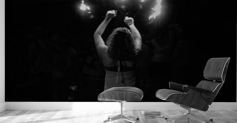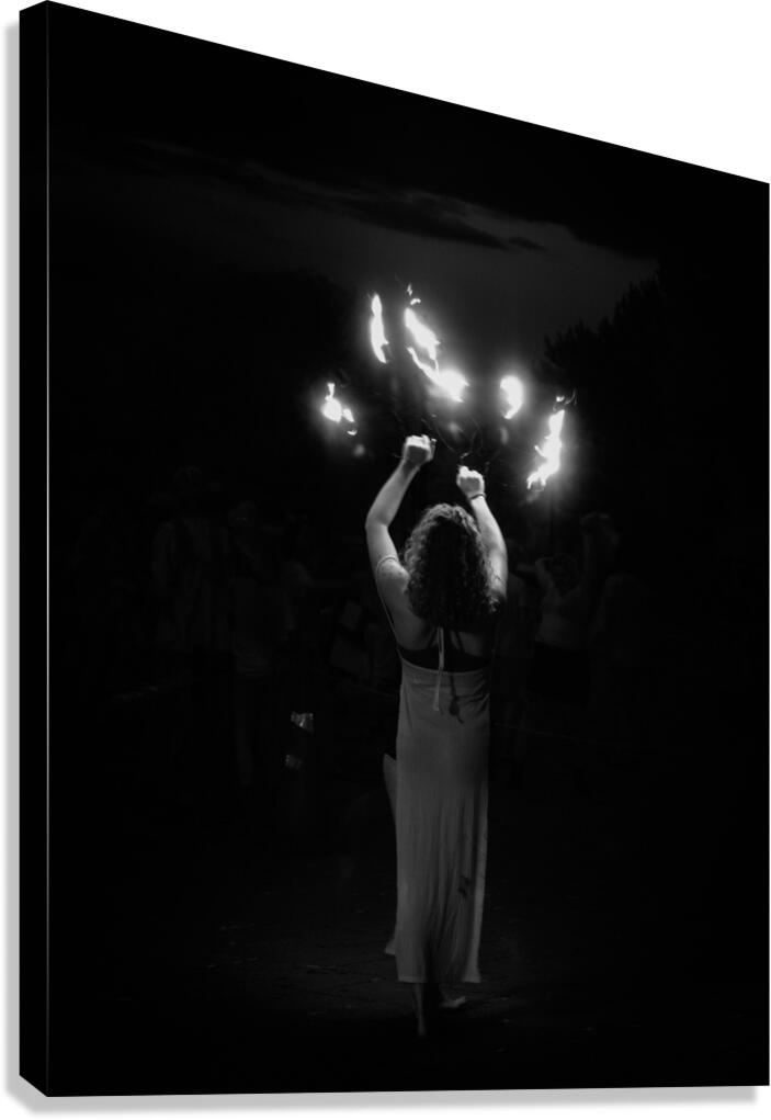 Torchlit Enigma unfolds as a dramatic tableau in monochrome where light and darkness dance in a mesmerizing ballet. At its heart a solitary figure stands shrouded in a flowing garment their presence both commanding and elusive. With arms raised they hold aloft two blazing torches whose fiery brilliance slices through the enveloping night. The interplay of light and shadow weaves a tapestry of contrasts outlining the contours of the scene with a luminous precision. The rampant flames cast a spectral glow that accentuates the stillness and poise of the figure whose back remains turned adding to the air of mystery. Each flicker of the torchlight seems to breathe life into the surrounding darkness infusing the moment with an aura of reverence and intensity. The stark tones of black and white do more than merely capture an image they elevate it to a realm where reality blurs with the fantastical. In this evocative composition the viewer is drawn into an enigmatic world where light becomes a beacon and shadow a shelter. Here suspended between the seen and the unseen lies a narrative that invites contemplation and wonder urging the audience to look beyond the visible into the profound silence of what remains untold.
