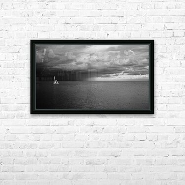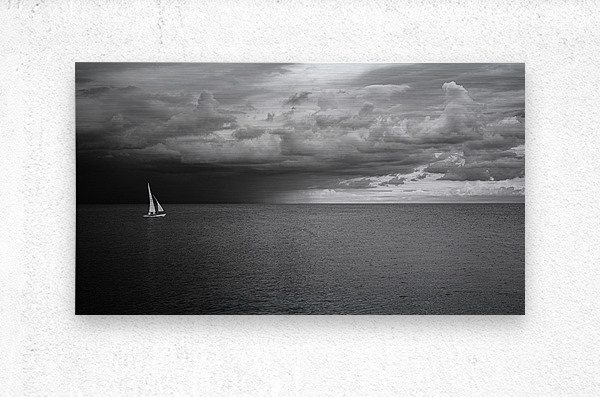Sailing Beyond the Storm's Embrace transports the viewer into a world where the ethereal meets the tangible, captured through the enigmatic medium of infrared black-and-white photography. Within the image, a solitary sailboat braves an expansive, tranquil sea, dwarfed by the vastness around it. The composition commands attention to the delicate interplay between light and shadow, sculpting a stark contrast that heightens the viewer's sense of duality. On one side, the horizon broods with ominous clouds, whispering of the tempestuous forces of nature, while a fragile glimmer of light fights to break through on the other, evoking a beacon of hope and solitariness. The scene's profound serenity is underscored by the sense of foreboding that accompanies it, offering a space for deep contemplation and introspection. The dance of light and darkness plays out dramatically in the sky, casting an almost surreal ambiance over the entire composition. This photograph does not merely capture a moment in time; it draws you into a mystical narrative of solitude and resilience, inviting the viewer to ponder the vast and often turbulent sea of existence.