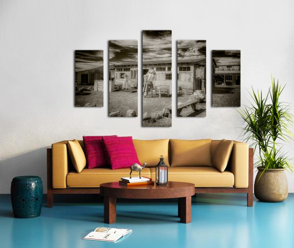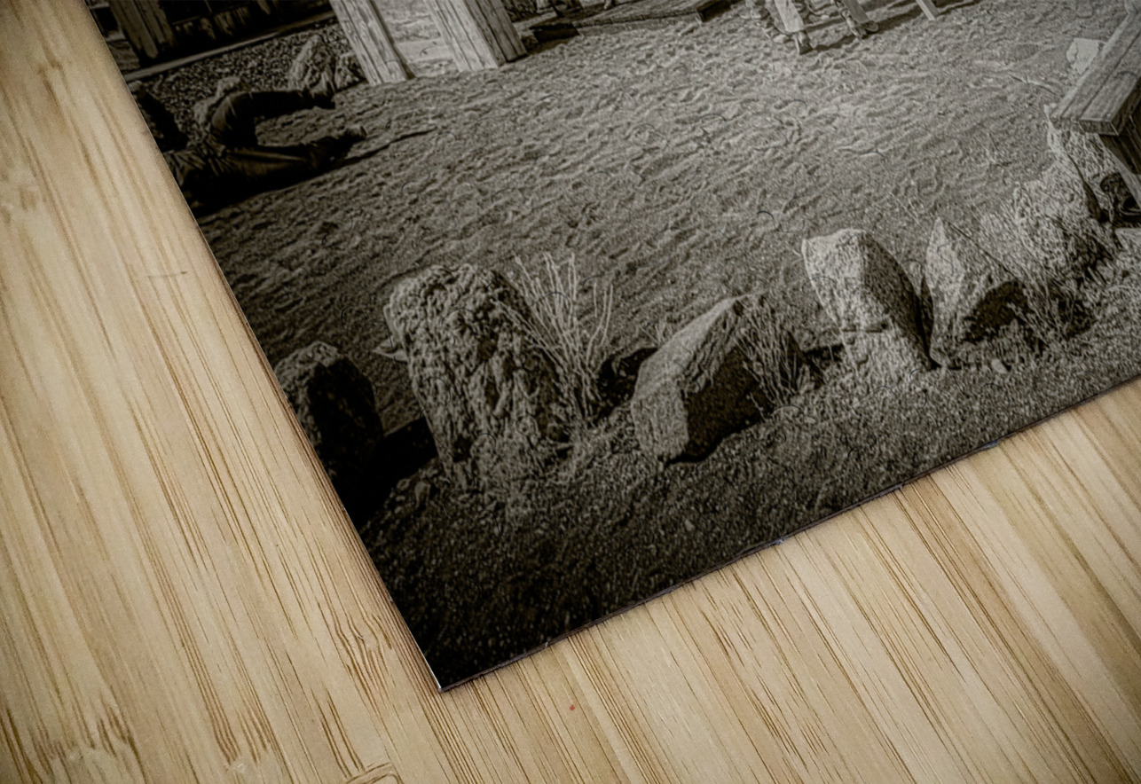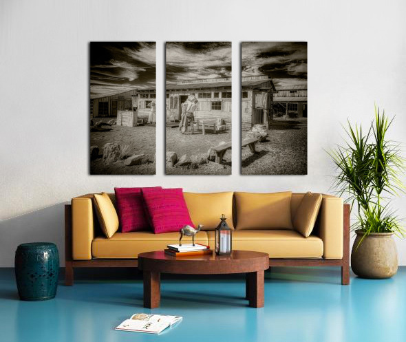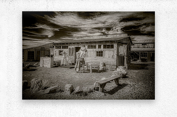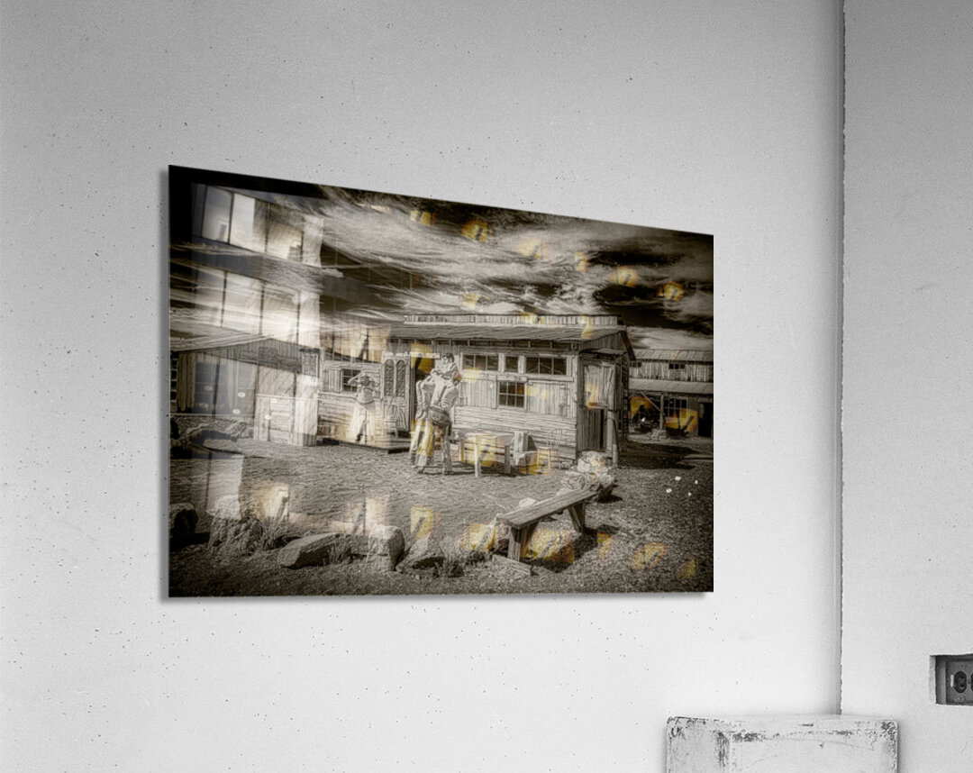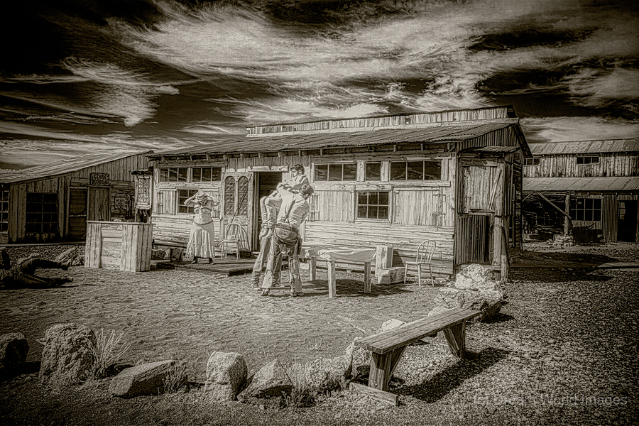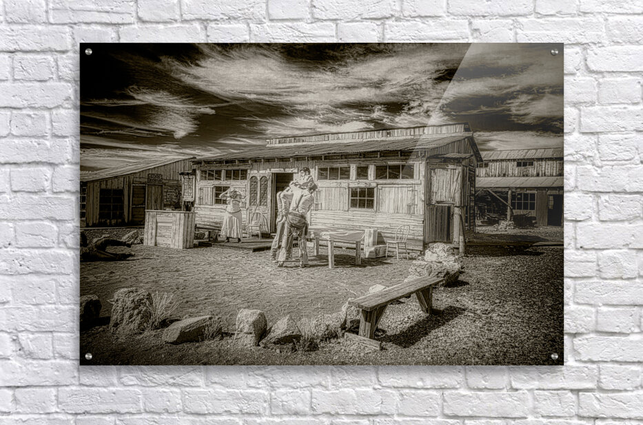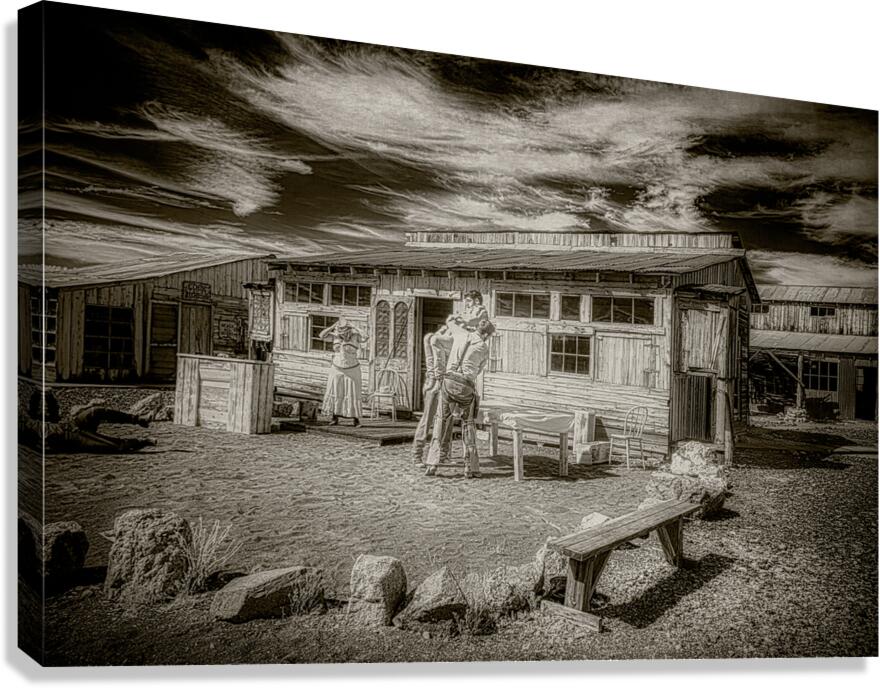 Enter a realm where time weaves its sepia-toned tapestry inviting the beholder into a narrative etched with echoes of a bygone era. This evocative photograph Frontier Clash on a Weathered Porch captures the whispers of the Wild West an era steeped in mystery and unpredictable allure. The scene unfolds upon the rustic facade of a wooden building its weathered planks textured with the stories of many seasons. Here the mundane is transformed into a portal of intrigue a setting where the fabric of time appears almost tangible. In the foreground a man clad in the attire of yesteryear stands poised in conversation or perhaps in subtle negotiation with a shadowy counterpart. His cowboy hat and chaps echo tales of rugged independence and daring exploits. Nearby a woman cloaked in a long flowing dress anchors the scene with an air of stoic grace. She lingers under the porch a silent observer or perhaps a keeper of secrets her presence both grounding and enigmatic. Above the sky broods with dense clouds a dramatic canvas adding depth to the scenes atmospheric embrace. It wraps the composition with an almost ethereal touch blending the tangible with the intangible the present with the past. Each element of this artwork invites the viewer to linger in its enigmatic embrace to ponder the unseen stories and the enigmatic relationships that unfold within this tableau of antiquity. Here the frontier spirit breathes anew captured forever in a moment of historical reflection and timeless narrative.