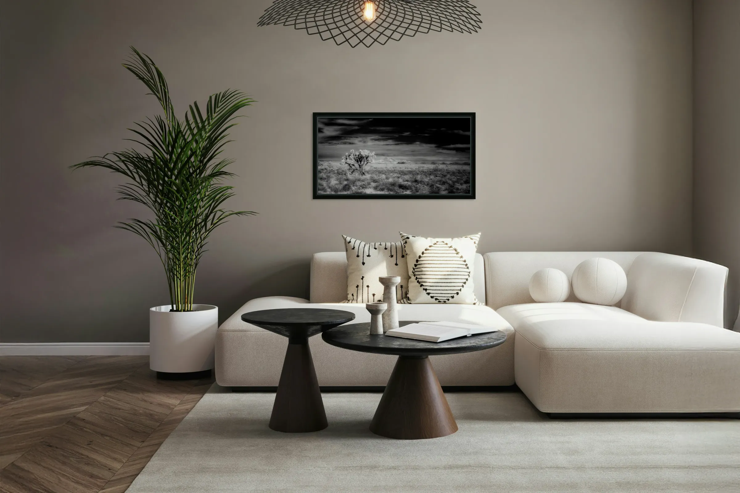 The breathtaking masterpiece Textured Realms of Silence and Cloud invites the viewer into a realm where silence speaks and the ethereal clouds dance in a celestial ballet. In this monochromatic portrayal a vast desert landscape unfolds exuding a mystical presence that transcends reality. Standing as a solitary sentry against time’s relentless passage a lone Joshua tree graces the foreground with its iconic silhouette a testament to resilience amidst desolation. Its twisted form is surrounded by sparse desert vegetation each shadow and line adding to the tapestry of silence and solitude that defines the scene. As your gaze drifts to the middle ground the expansive flat terrain stretches like an ancient parchment leading the eye to majestic mountains that linger on the horizon—guardians of secrets untold. The mountains rise with solemn grandeur a reminder of nature’s eternal vigil over the earth below. Above the sky unfurls in a mesmerizing play of swirling clouds their ethereal shapes weaving a narrative of mystery and wonder. Each wisp and billow is a brushstroke in this grand composition with the dynamic contrasts of light and shadow creating a sense of motion in the stillness. The use of a black-and-white palette elevates the textural elements of the landscape compelling the viewer to not merely see but to perceive the hidden layers and stories etched by time. Each crevice each cloud whispers an enigmatic tale inviting deep contemplation. Here the textures of the natural world collide with the infinite silence of the skies crafting a sacred moment suspended in time where the earthly meets the divine in a dance as ancient as the sands themselves. To stand before this work is to feel the vastness of the universe as the realms of silence and cloud unravel their whispered secrets to those who dare to listen.