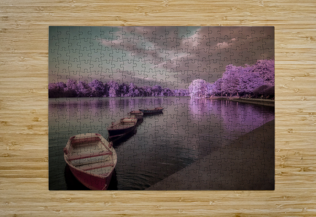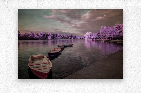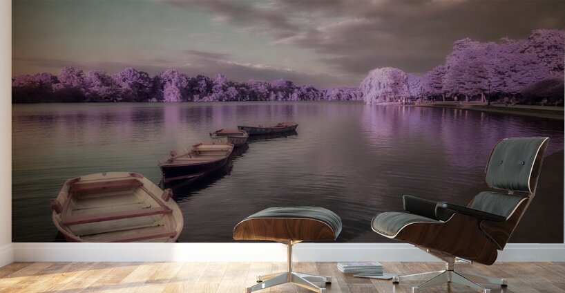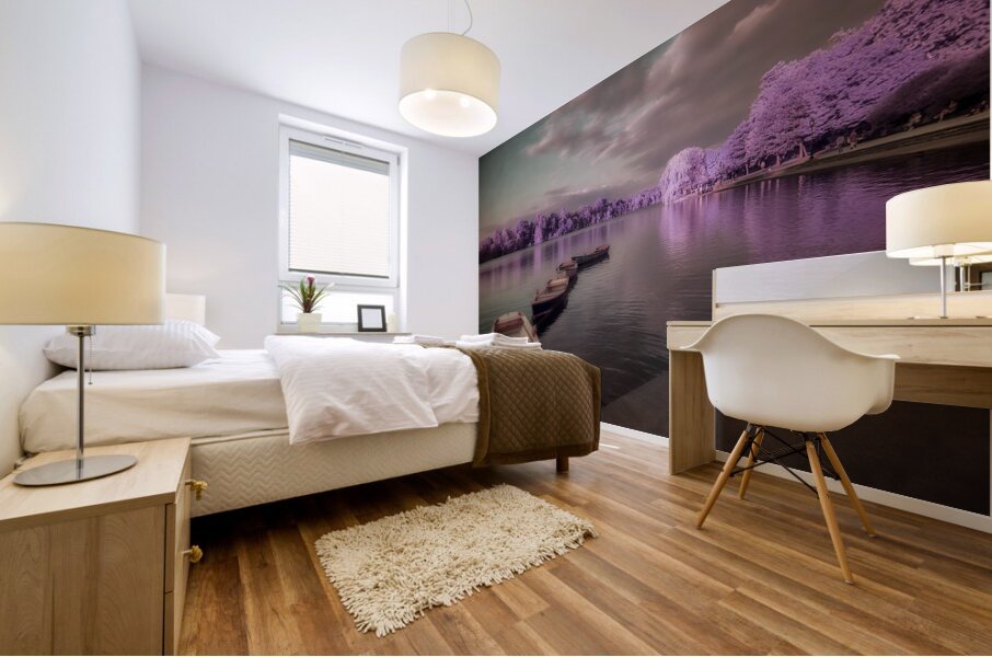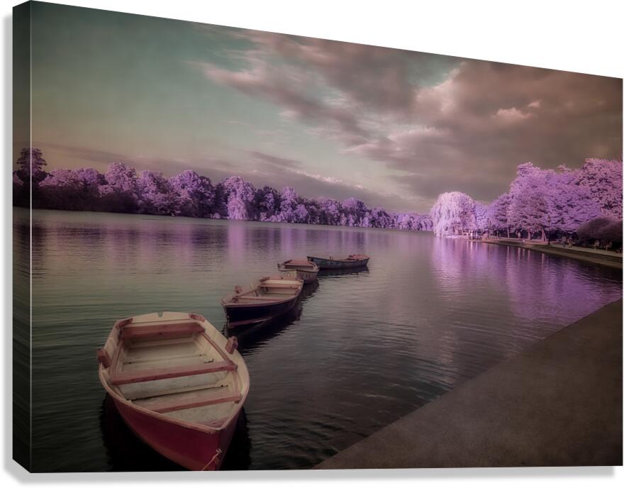 Lavender Waterscape Reverie enchants the viewer with its surreal and tranquil ambiance. Imagined through a photographic lens this piece transports one to a mystical lakeshore where reality seems to blur into a dream. Subtle purples and delicate pinks wash over the landscape painting the waters and skies with an ethereal palette that soothes the soul. The scene is dominated by a serene body of water upon which several small boats are gently moored along the shore. These vessels dressed in dark muted hues offer a striking contrast against the enchanting lavender-and-pink forest that envelops the waters. The trees stand as silent guardians their reflections mirrored perfectly on the glasslike surface creating an illusion of endless depth and tranquility. A tapestry of clouds blankets the sky their muted tones perfectly harmonizing with the surrounding scenery enhancing the dreamlike quality of the setting. The atmosphere is imbued with a sense of stillness inviting the viewer to lose themselves in this enigmatic reverie where natures colors are both delicate and profound. This photograph offers a glimpse into a world where serenity and surrealism coalesce crafting a space that is as mysterious as it is calming.