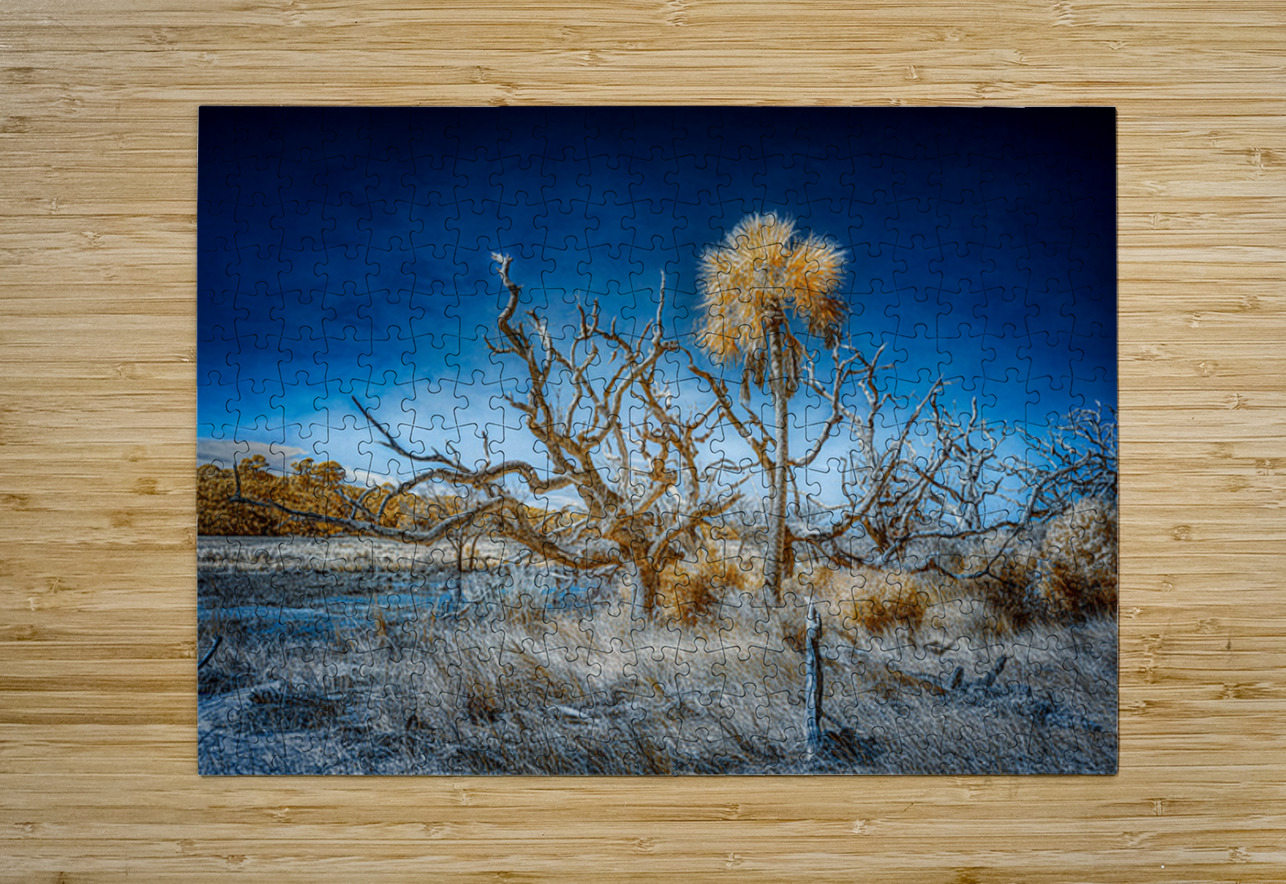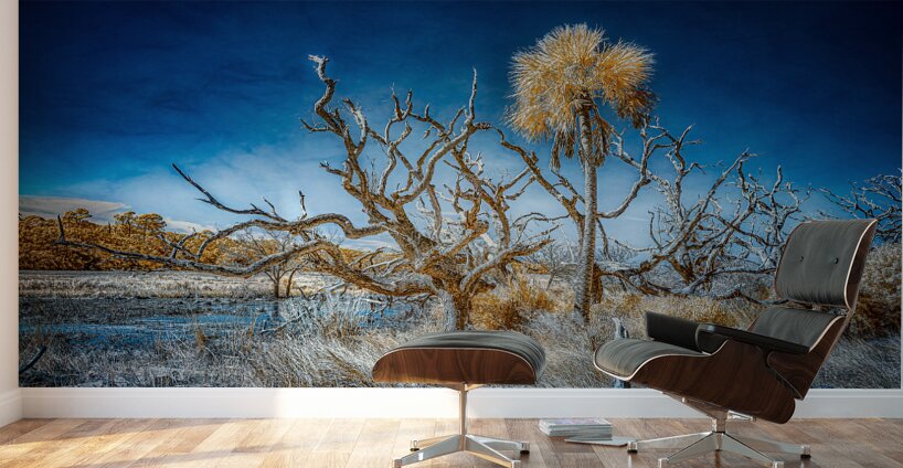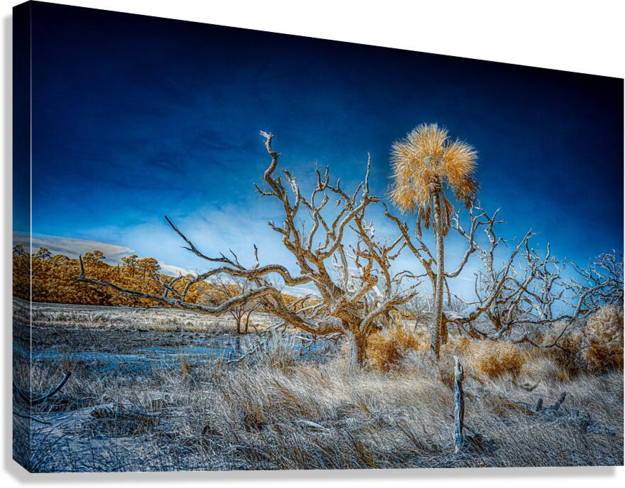 Step into a realm where natures poetry comes alive – witness the haunting beauty of Driftwood Beach nestled on the shores of Jekyll Island Georgia. In this mesmerizing infrared image a scene of ethereal tranquility unfolds before your eyes. At the end of a row of majestic dead trees weathered by time and tides stands a lone palm tree its silhouette striking against the marshy expanse. Like a sentinel guarding over the landscape it stands tall a testament to resilience amidst the elements. Through the lens of infrared photography the world transforms into a surreal dreamscape where reality merges with imagination. In this timeless spectacle hues of infrared breathe life into the scene infusing it with an otherworldly glow that dances across the landscape. Here natures melancholic beauty takes center stage weaving a tale of contrasts and serenity. The juxtaposition of life decay stillness and motion creates a visual symphony that resonates deep within the soul. As you gaze upon this captivating image let yourself be transported to a realm where time stands still and the whispers of the wind carry the secrets of centuries past. Driftwood Beach beckons inviting you to lose yourself in its mesmerizing embrace and discover the profound beauty that lies within. Experience the magic of Driftwood Beach – where every photograph tells a story and every moment is a masterpiece waiting to be captured.