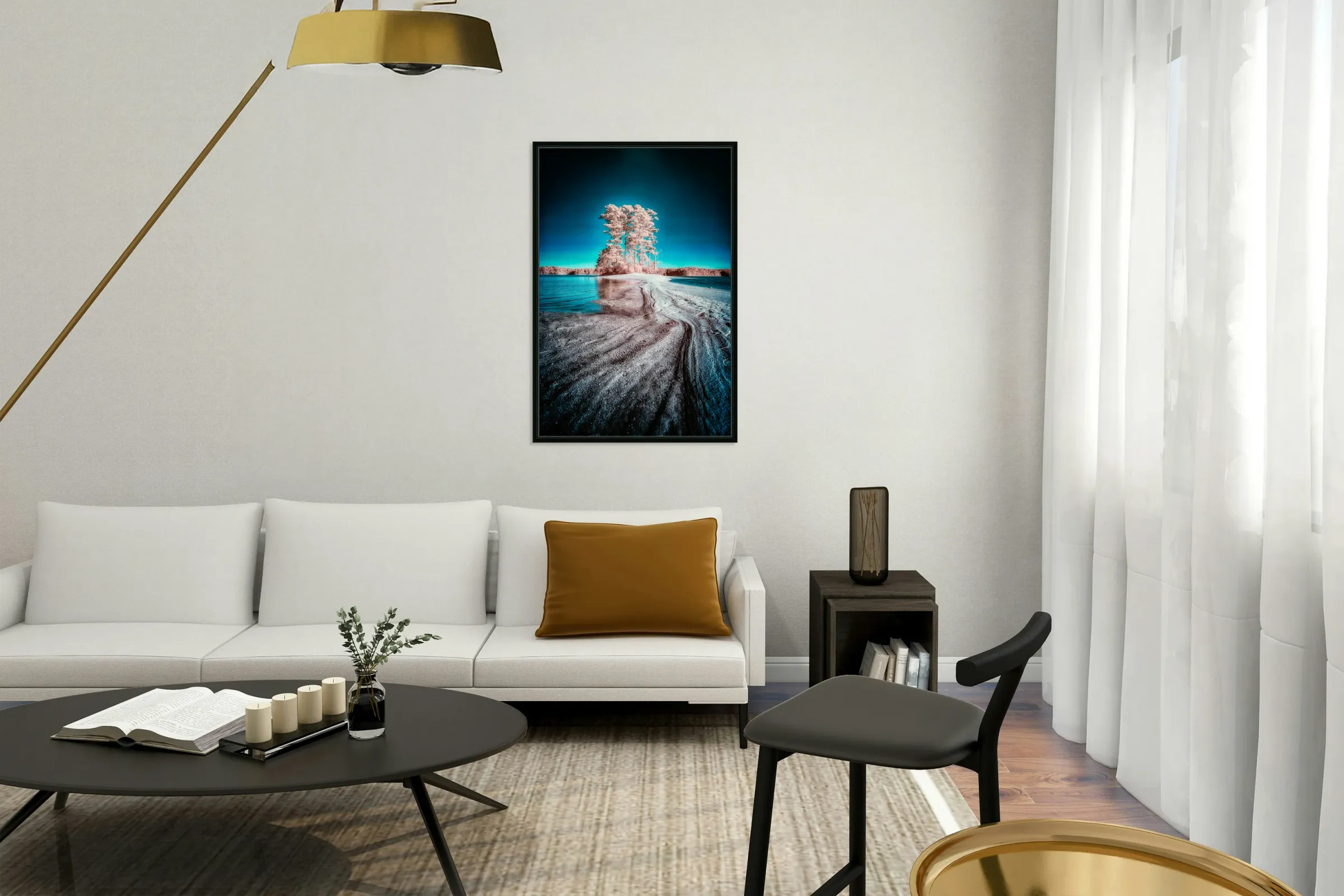 Embark on a captivating visual journey as we travel the enchanting landscapes of Wind Creek State Park where natures vibrant palette is revealed in a breathtaking infrared image. In this immersive scene a cluster of trees typically surrounded by water finds itself connected to the mainland through a sandbar unveiled during lower lake levels. The ethereal sentinels the trees are transformed into captivating figures bathed in light red hues standing resilient against a vibrant blue sky that deepens toward the edges. As the sun casts its golden rays the play of light and shadow adds depth and dimension to this mesmerizing tableau. This captivating infrared photograph captures the exquisite convergence of elements—a surreal dance of reds and blues that breathes life into the unique landscape of Wind Creek State Park. The sandbar a transient pathway serves as a visual guide leading the viewer into the heart of this captivating scene where natures vibrant colors and the parks distinctive topography come alive. As we immerse ourselves in this tapestrys intricate details the sandbars transient nature becomes a metaphor for the ever-changing beauty that Wind Creek State Park offers. The interplay of vibrant colors and the unique landscape create a harmonious visual symphony inviting you to explore the parks dynamic and diverse ecosystem. Titled Out There this image is more than a photograph its an invitation to witness the magical transformation of nature where Wind Creek State Park becomes a canvas for the interplay of colors light and shadow. Join us on this visual odyssey and let the enchanting allure of natures alchemy unfold in every pixel of this mesmerizing infrared scene.