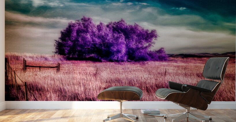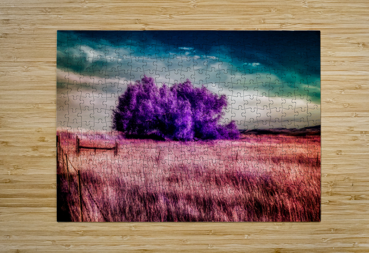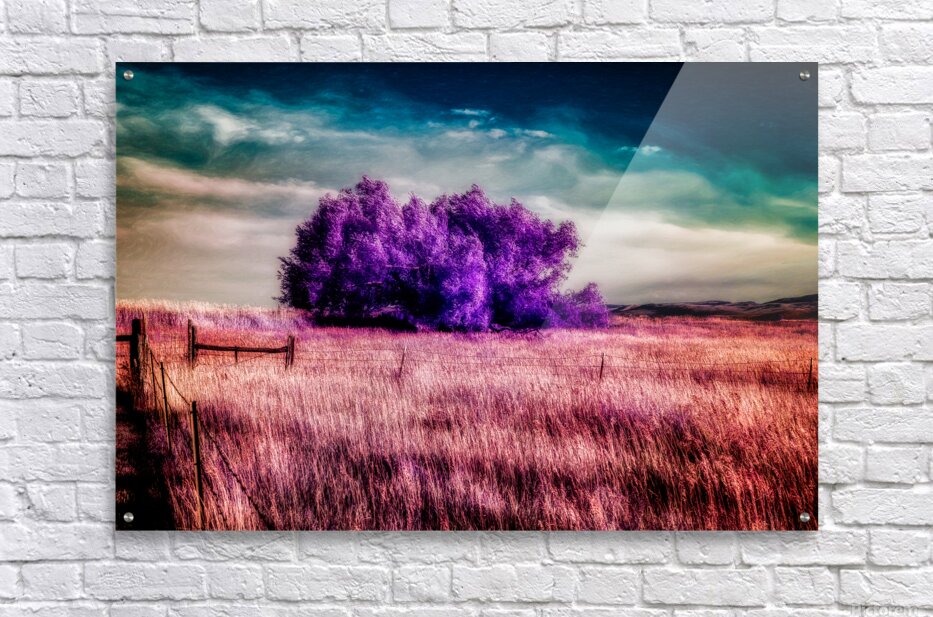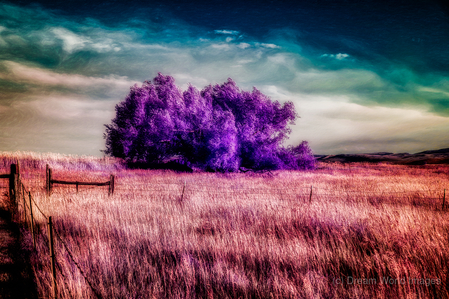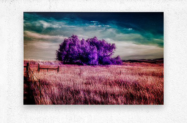 In the windswept prairies surrounding Lander Wyoming where sagebrush has weathered countless seasons beneath the endless sky infrared light reveals a hidden kingdom of amethyst wonder. This solitary grove stands like a jeweled crown in a sea of rose-gold grass its purple foliage transformed into something from a fairy tale. The weathered fence posts mark the boundaries between the known and the mystical while dramatic clouds gather overhead like ancient spirits watching over this sacred space. Here in the heart of Wyomings high desert natures secret palette emerges—a world where ordinary sagebrush becomes extraordinary where the familiar landscape transforms into a realm of pure enchantment.