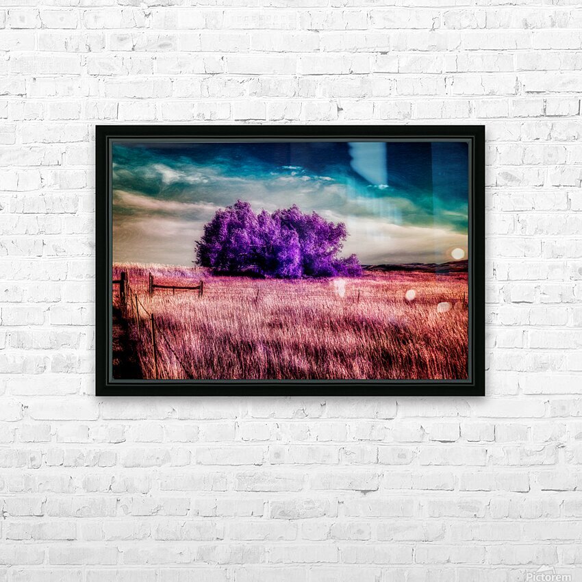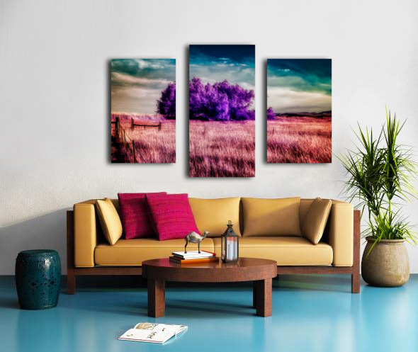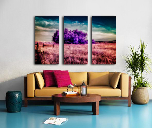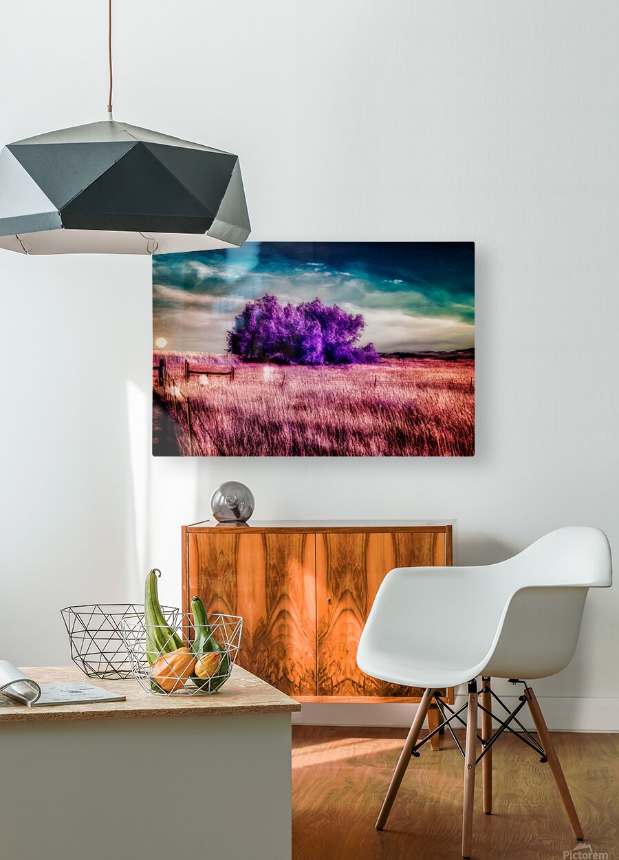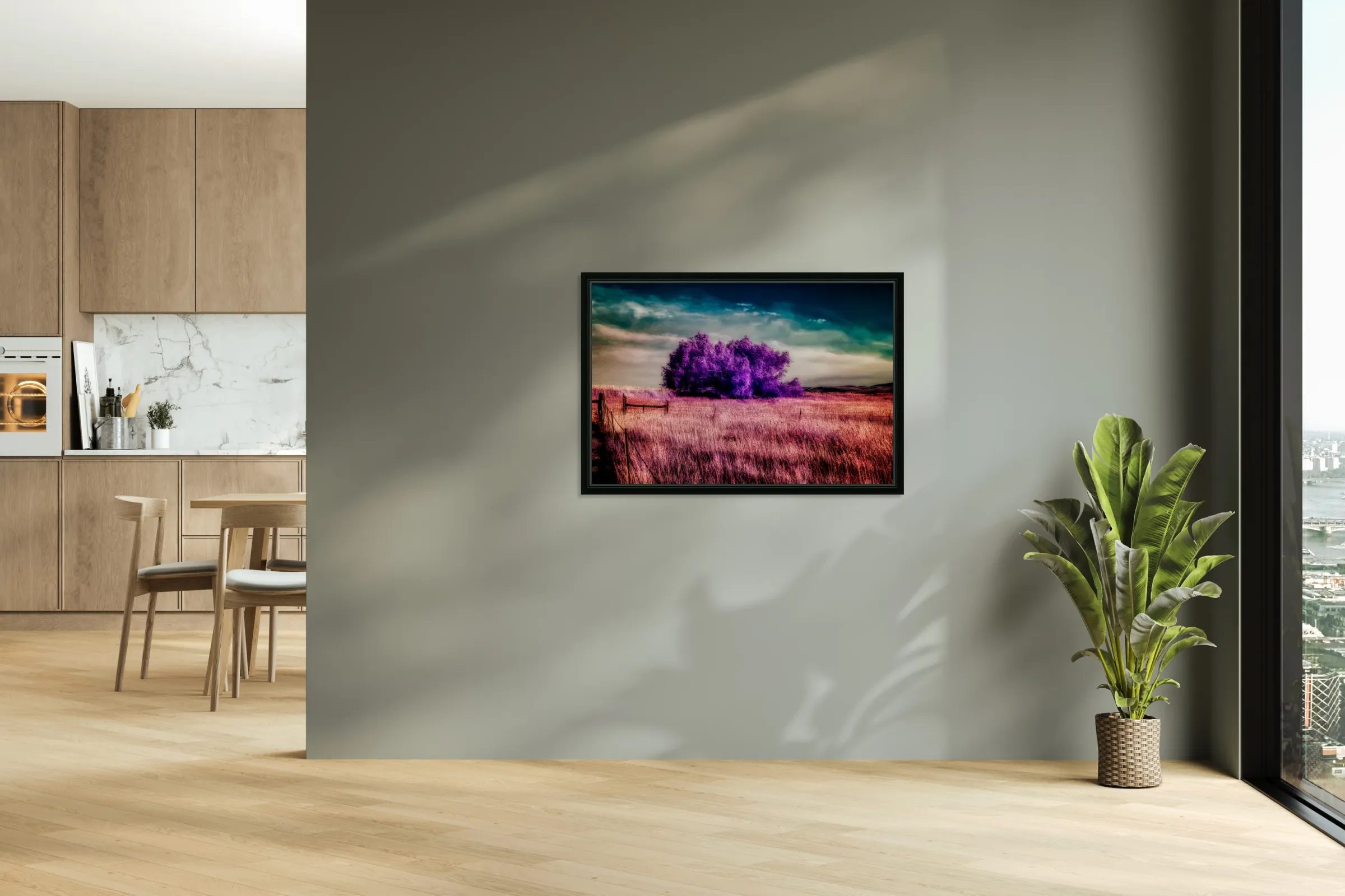 In the windswept prairies surrounding Lander Wyoming where sagebrush has weathered countless seasons beneath the endless sky infrared light reveals a hidden kingdom of amethyst wonder. This solitary grove stands like a jeweled crown in a sea of rose-gold grass its purple foliage transformed into something from a fairy tale. The weathered fence posts mark the boundaries between the known and the mystical while dramatic clouds gather overhead like ancient spirits watching over this sacred space. Here in the heart of Wyomings high desert natures secret palette emerges—a world where ordinary sagebrush becomes extraordinary where the familiar landscape transforms into a realm of pure enchantment.