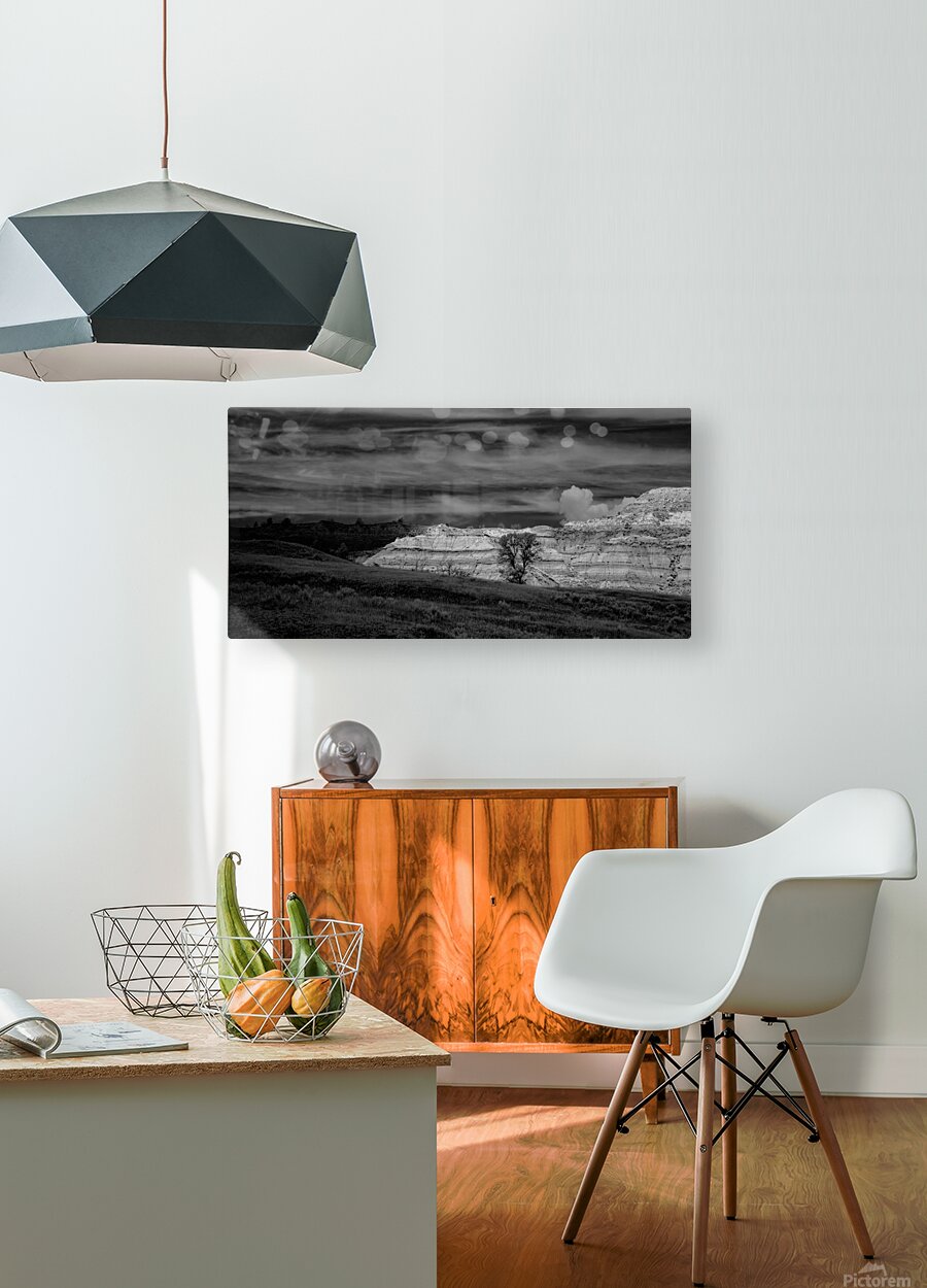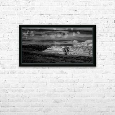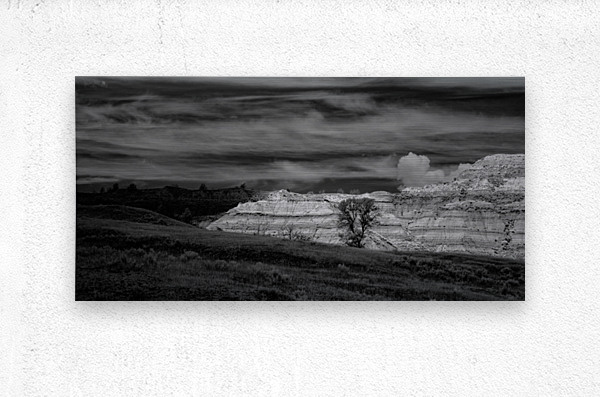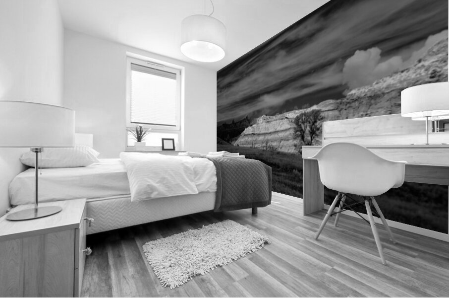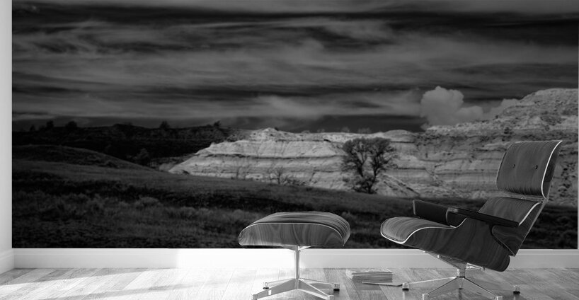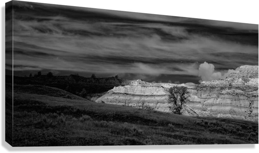 In the remote reaches of Theodore Roosevelt National Parks North Unit ancient badlands formations rise like monuments to the patience of geological time their layered walls telling stories that span millions of years. This powerful black and white composition captures the raw majesty of these sedimentary sculptures where wind and water have carved masterpieces from stone with the precision of master artists. The lone cottonwood trees nestled among the formations provide scale and life to this ancient landscape while the dramatic sky above mirrors the undulating rhythms of the earth below. Here where Theodore Roosevelt first understood the profound connection between conservation and national character we witness the same timeless beauty that inspired a president to become Americas greatest champion of wild places. These are not just rock formations - they are cathedrals of stone temples to endurance and reminders that some things are too magnificent to lose.