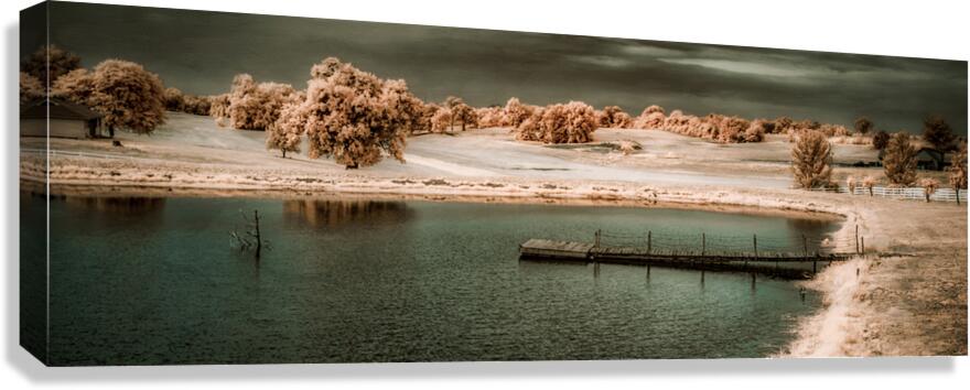 A quiet pond stretches across the foreground like a held breath its surface dark and steady beneath a sky that feels heavy with weather. Beyond the water the pastureland glows in soft dream-tilted tones—trees lit like embers fields washed pale and a small dock reaching out as if it’s testing the silence. The scene carries that strange calm you feel right before a storm: everything still everything listening. It’s rural life rendered as a kind of spell—simple fences open land and water that mirrors the mood—inviting you to slow down and let the world feel wide again.