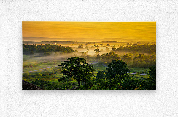 From Little Round Top the Gettysburg landscape opens like a wide golden breath—fields and tree lines layered into the distance while morning fog poo