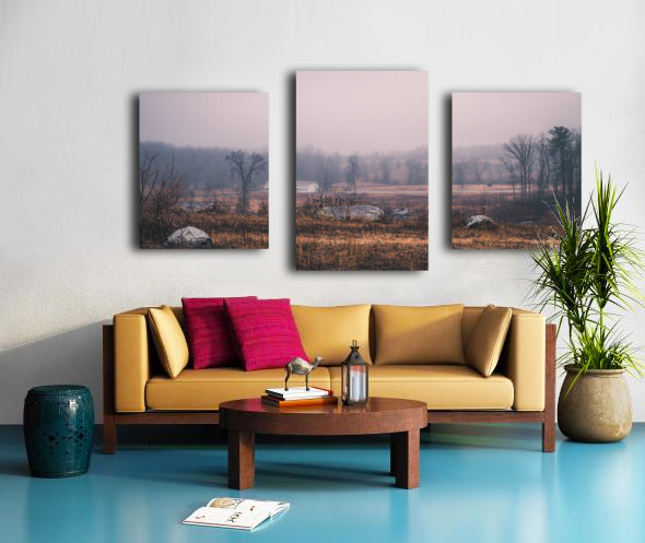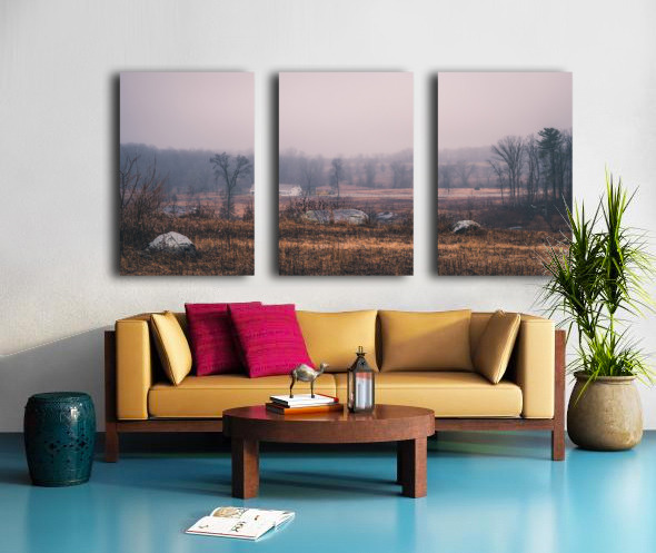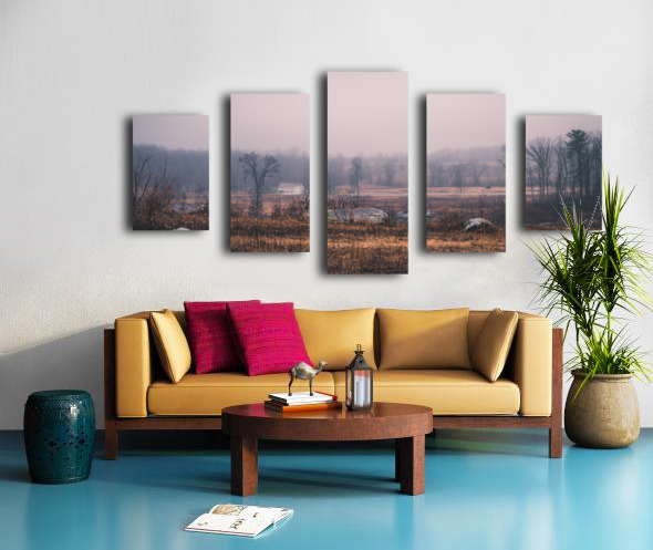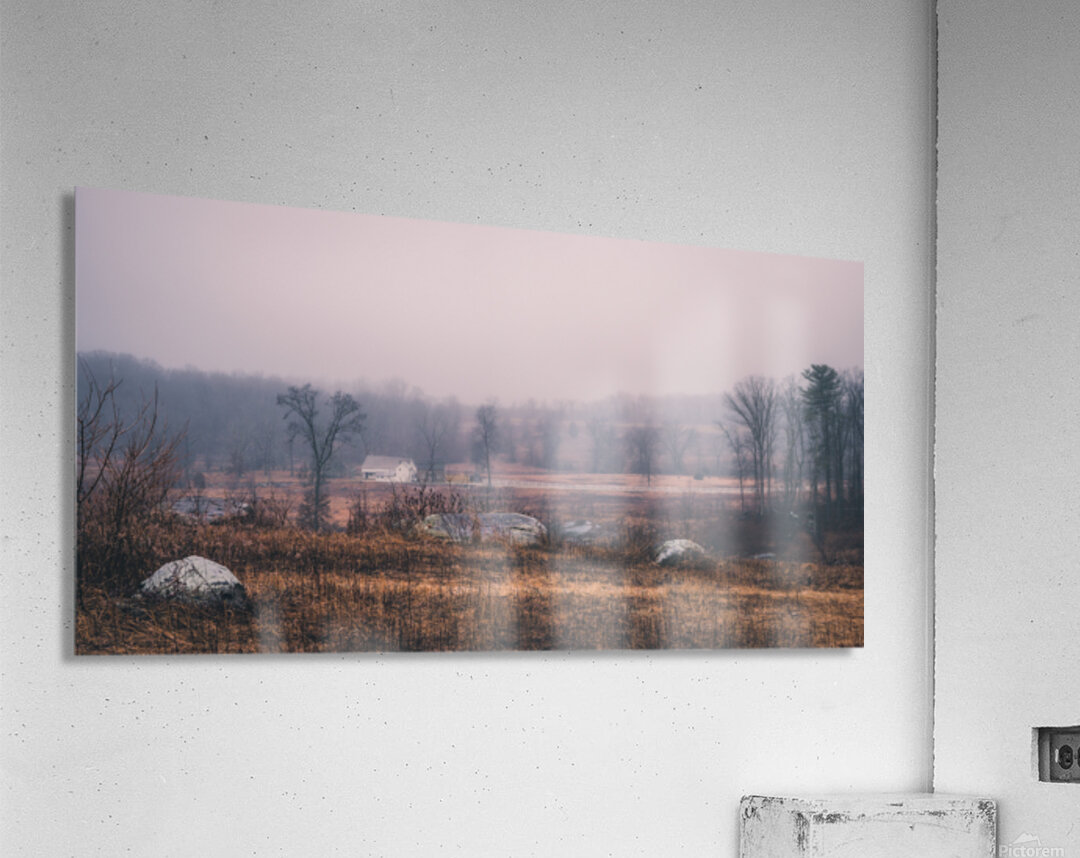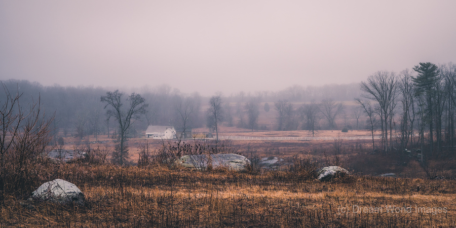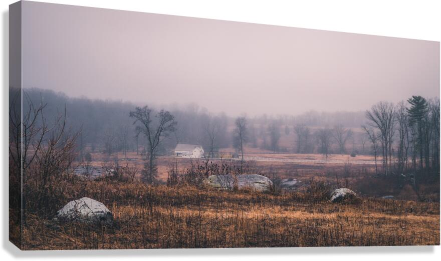 Through winter's gentle mist, the historic Slyder Farm emerges from time's veil. This humble homestead, caught between Confederate lines and Big Round Top, witnessed history unfold during those fateful July days. Now, as morning light bathes the scene in subtle rose and amber tones, the weathered rocks and winter-bronzed fields stand as quiet guardians of memory.